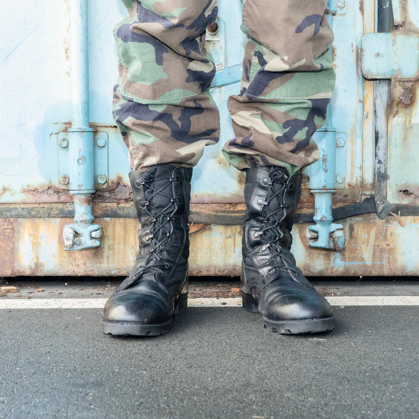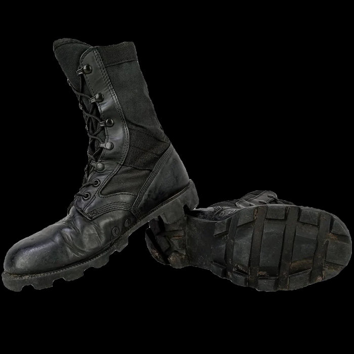 These versions are post-Vietnam war and made under contract for the Brits, because their version was rubbish. These have been sized but we found that some labels in the tongue don't match the soles (surplus shoes, what can ya do?). These boots have vent holes and a breathable but strong nylon canvas upper to aid in ventilation and moisture drainage. There is also a metal shank inside the sole. No this is not a James Bond style hidden knife, it's actually for protection from bamboo stake traps or other things that could penetrate the sole. The Panama style soles allow mud to flow out the sides to stop your feet from getting sucked down further. Going for that 'nam aesthetic or after some kickers unafraid of the mud - these are a good bet. Plus, they already have the vintage weathering so no need to feel bad about treating them mean!