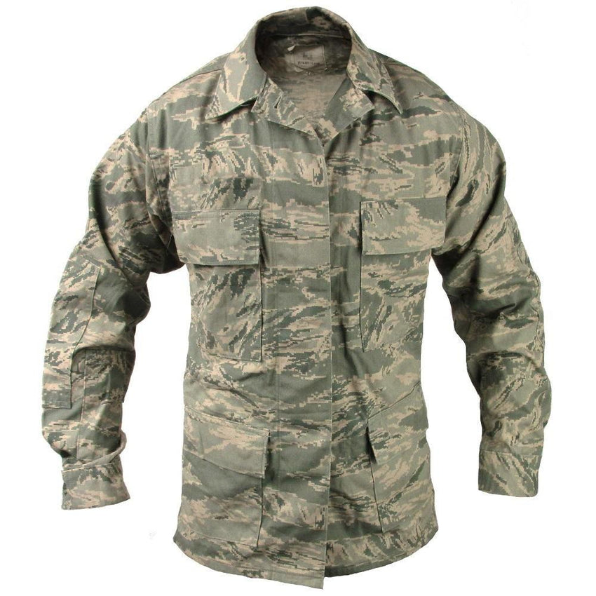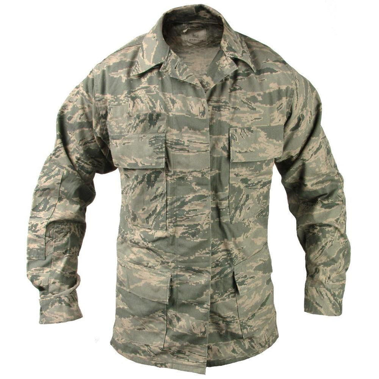 These woman's utility coats feature the same camouflage pattern as the Airman Battle Uniform (ABU) of the US Air Force - the digital tiger stripe pattern. Originally the coat began being issued in 2007 for the ground personnel. The distinctive camouflage is a mix between Vietnam War-era tiger stripe and a pixel pattern which will look great in a military collection or for use in airsoft and paintball.