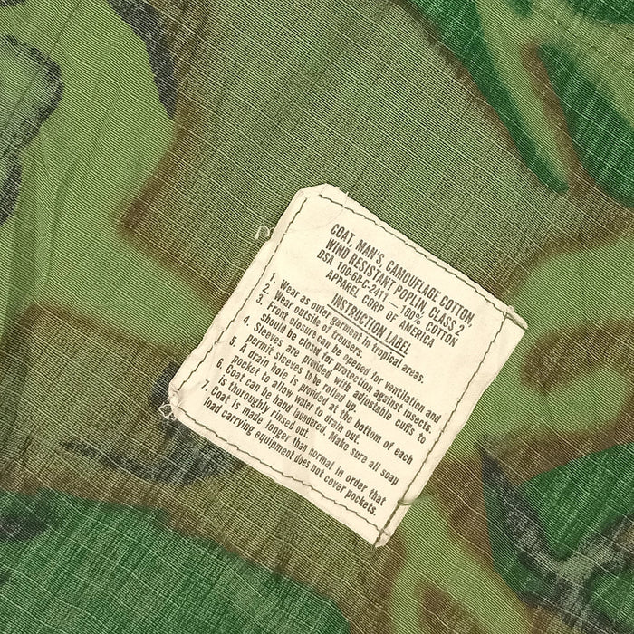 US issue slant pocket TCU ERDL jungle fatigue shirt. DSA appears to read 1968. Incredible example of green dominant ERDL, barely worn, though a tiny scuff to the back right (near armpit), in a hard to find size.