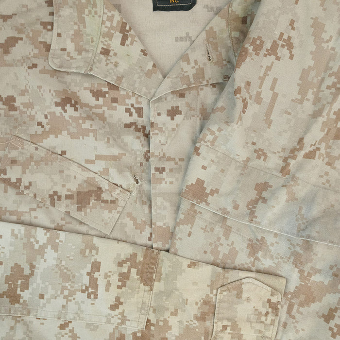 This classic desert MARPAT shirt has reinforced elbow pads and four pockets, two on the shoulders for tactical item retrieval and two on the chest. A tough nylon/cotton fabric ensures a long life of heavy use for this shirt, though some of these have been worked harder than others!