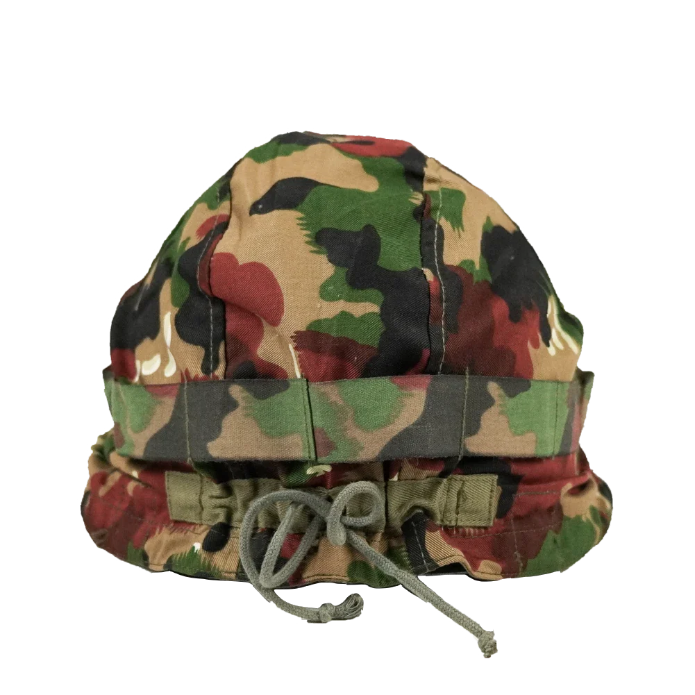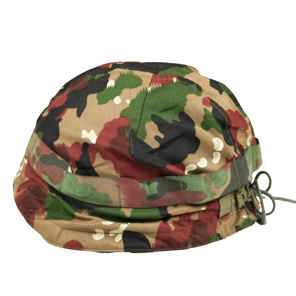 Swiss M71 helmet cover in Alpenflage camouflage. Fabric cover designed to fit the M71 helmet profile, with edge finishing and attachment points.