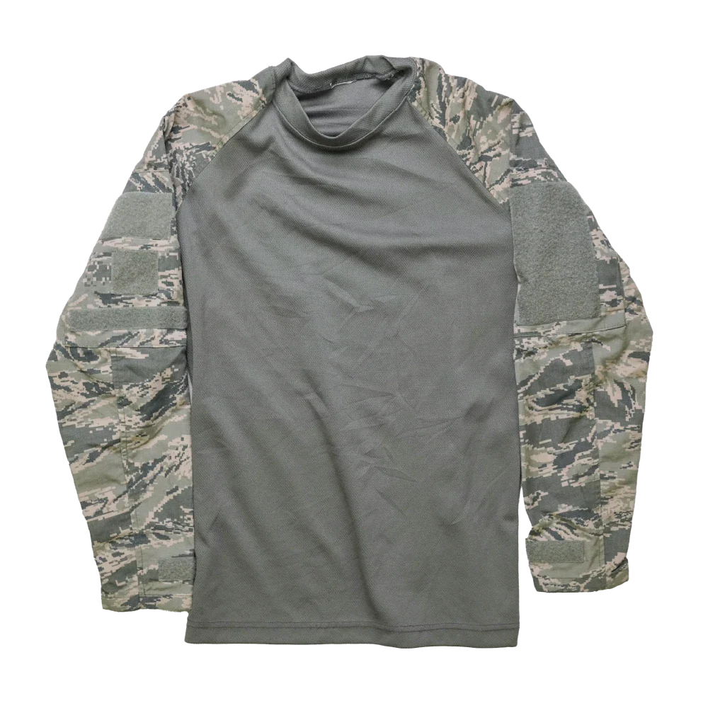 US Air Force ABU UBAC shirt in digital tiger stripe camouflage pattern. Features a quarter-zip front with stand collar and reinforced shoulder panels.