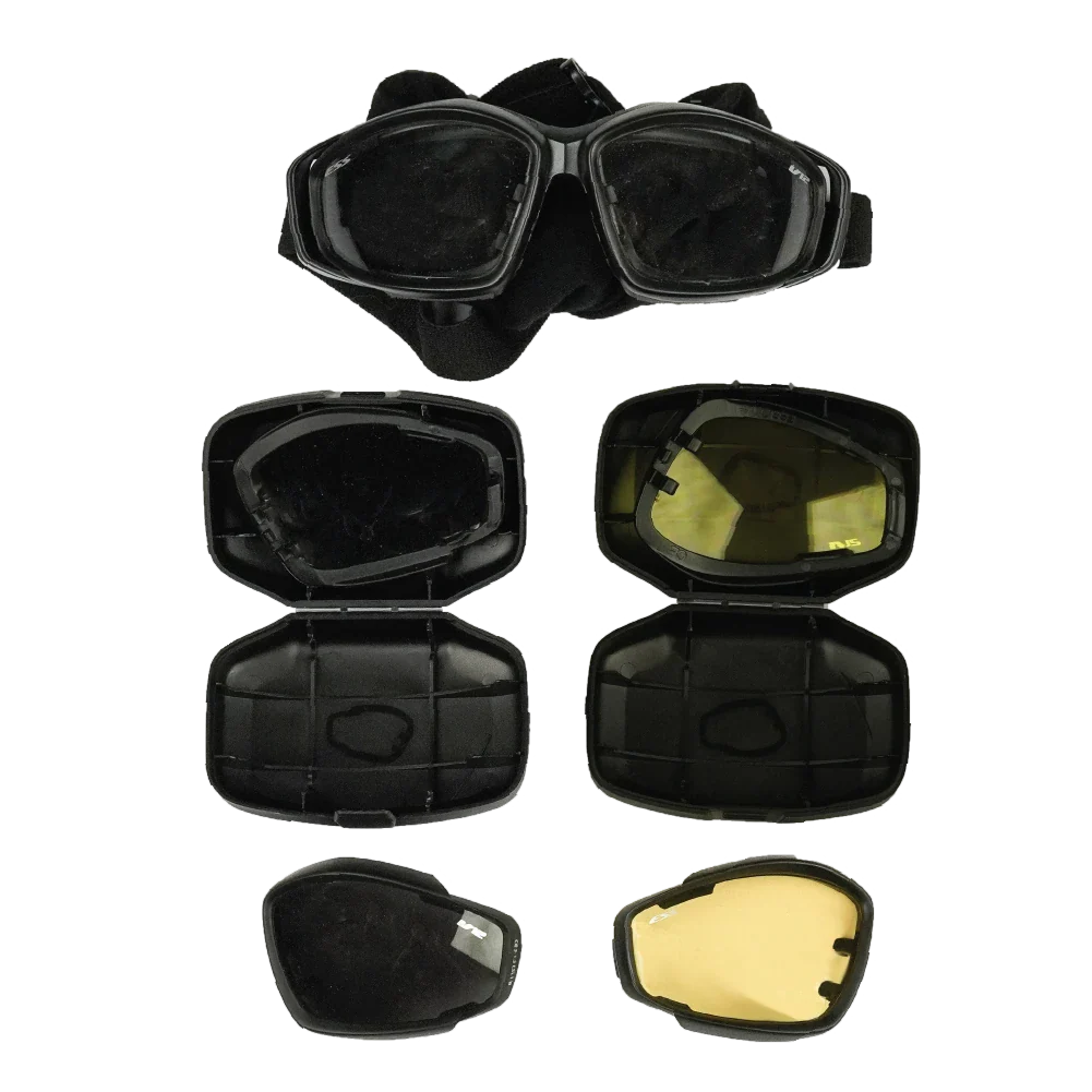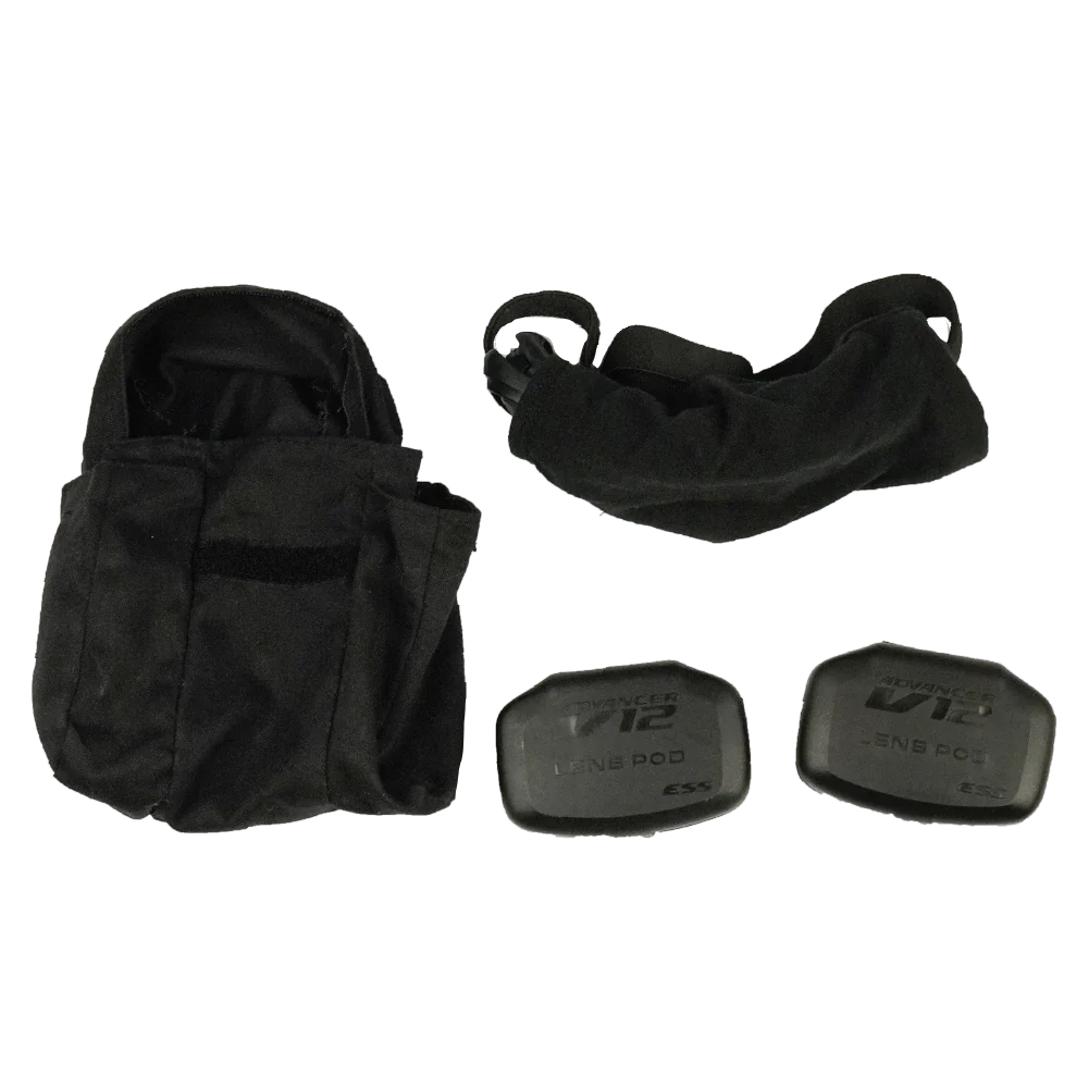 ESS V12 Advancer goggle system. Goggles are supplied in black and include multiple interchangeable lenses stored together in a pouch.