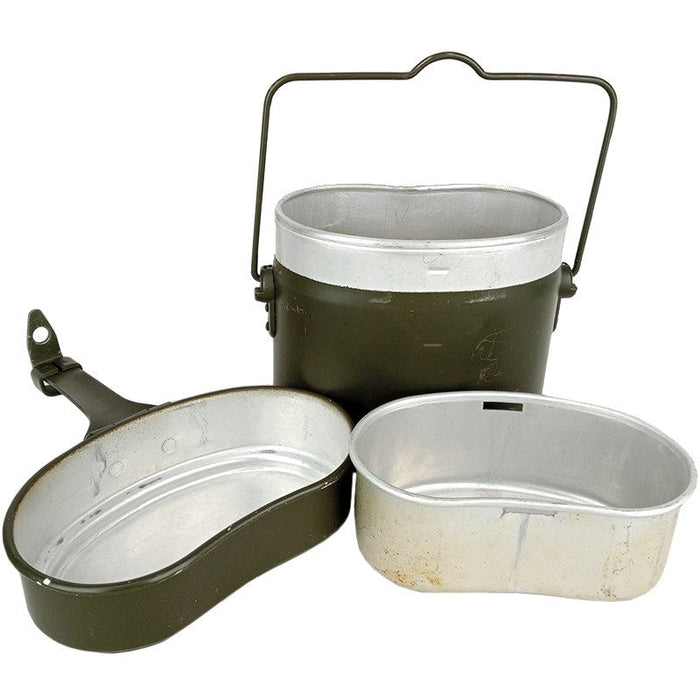 The Germans seem to have set a standard as their southern Austrian counterpart have copied their successful design. The mess kit breaks down into 3 parts and with a convenient carrying handle. Another similar sized tin slots into the large main section providing 3 different vessels for cooking. Some of these have slightly different colours between the lid and body and some appear to have been over sprayed in dark grey (like field grey). Some have different handle attachment fixtures and may be an older model. All used sustenance components are display/prop/collectable only and not for consumption use.