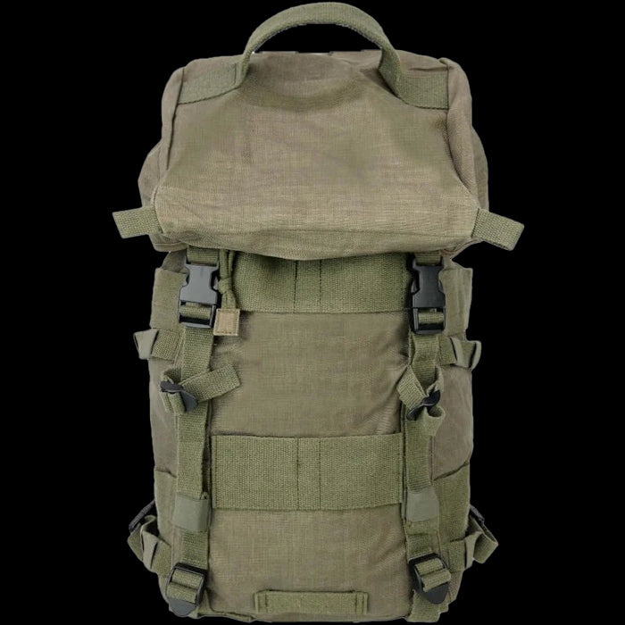 The pack has one large main compartment with 2 slim pouches in the back. Useful for your daily carry around town you can keep your spare clothing, stationary and books all separate and organised. This main compartment has a draw cord closure (which can help compress its contents down) as well as an extra sack sewn in around the opening. This sack can be sunken down into the main compartment and used as a divider or expanded upwards above the opening to increase the packs capacity. Speaking of adapting for the mission - the lid of the pack is fully removable. The main pack can be used stand alone with its draw cord closure at the top for when your require quick access. Externally the pack is lined with cotton canvas strips compatible with ALICE clips if you want to add more pouches.