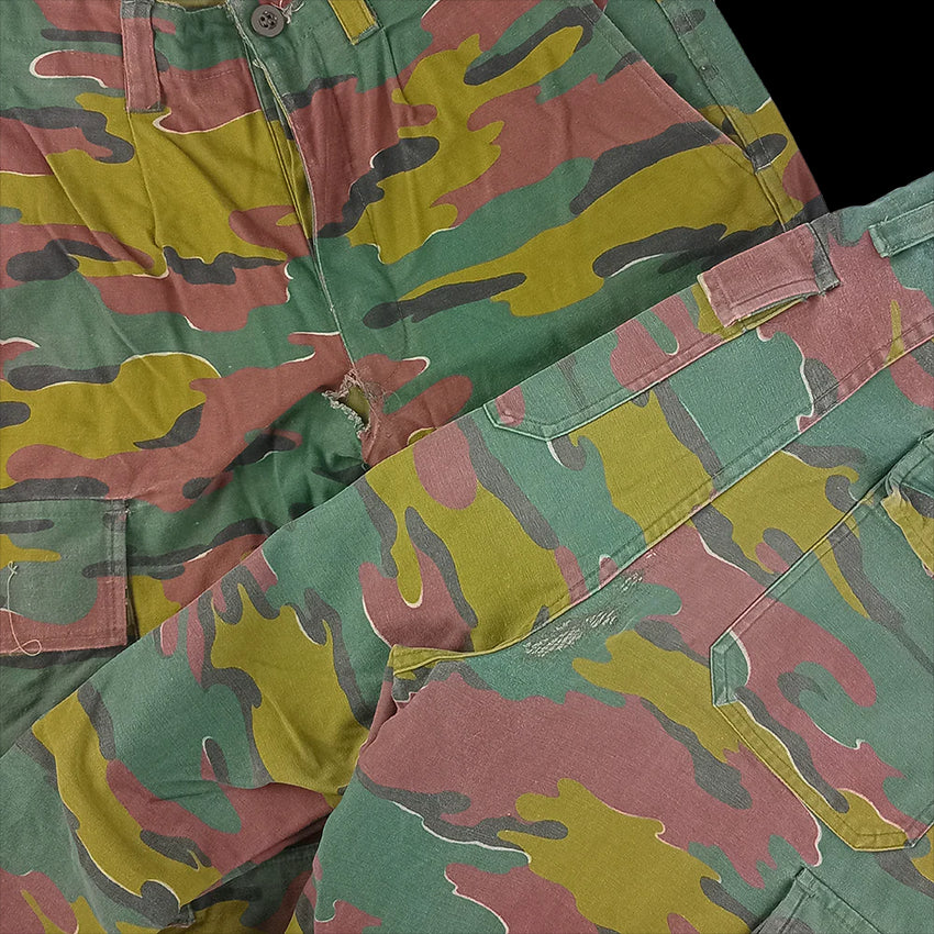 The good old 'jigsaw' pattern dates all the way back the 1960s - these pants are what the Belgian Army issued with an updated pattern from the 1990's onwards. This version has a much more heavier weight to them allowing them to be used in colder months. In our latest batch are slight variations in colour, with mustard yellow to yellow-green in the lighter splotch. These have been pretty well utilised and some may have worn areas or very small holes.
