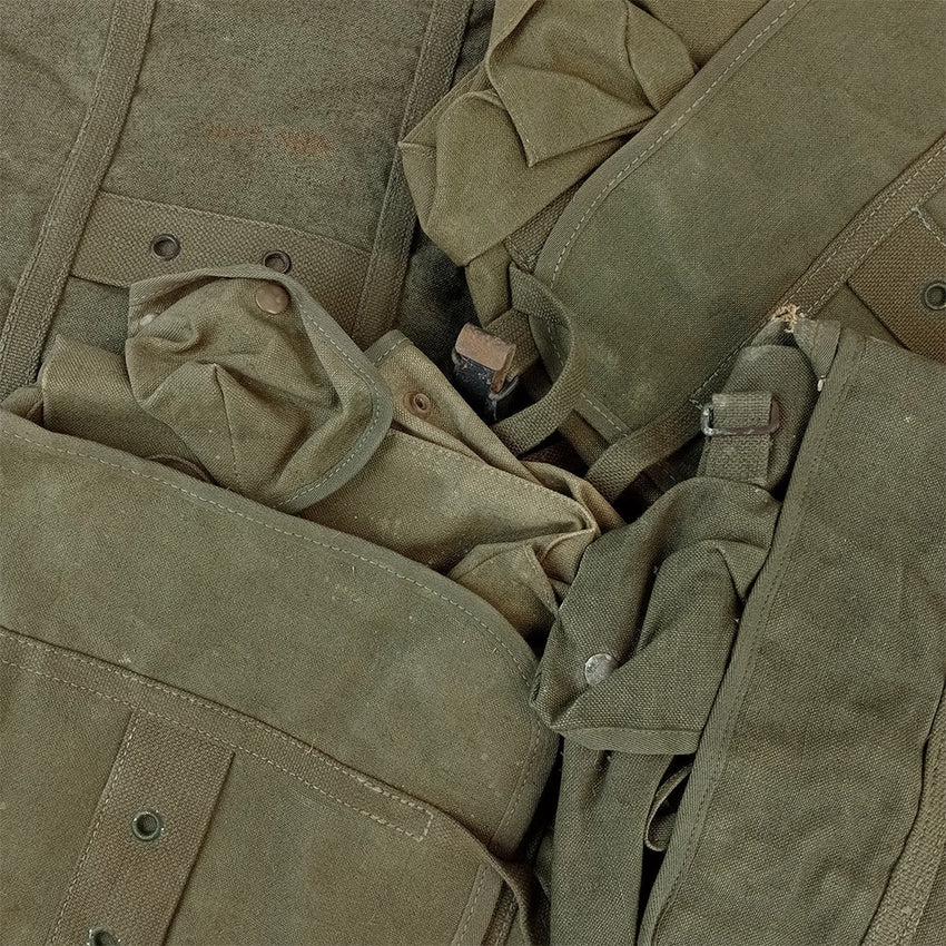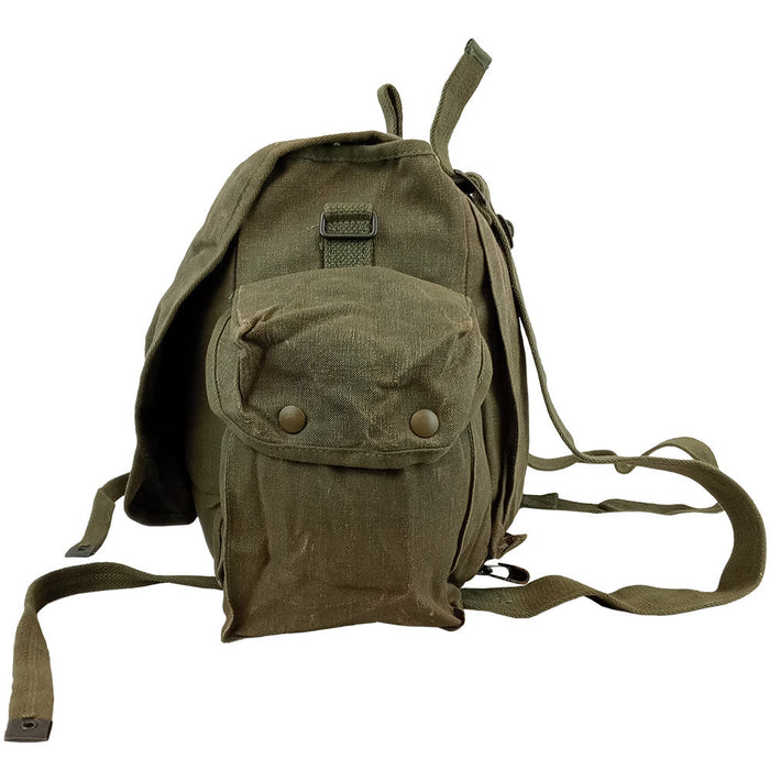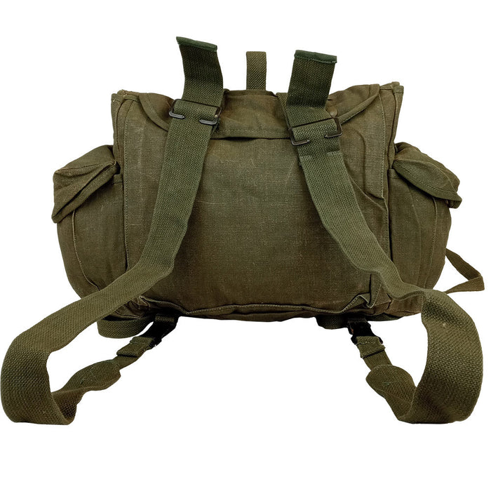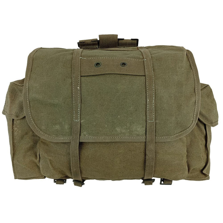 Belgian canvas rucksack, simple as. This handy pack's design was copied from the French and originates from the early 60's, when Belgium's colonisation of the Congo went kaput. Later in the 70's, these packs were made with PVC type material. As these packs are rugged canvas but still moisture friendly, they have encountered some storage damage, including corrosion and mould. A good clean up should fix most of these bag's issues though there may be problems with the snap domes where corrosion has attacked especially hard.