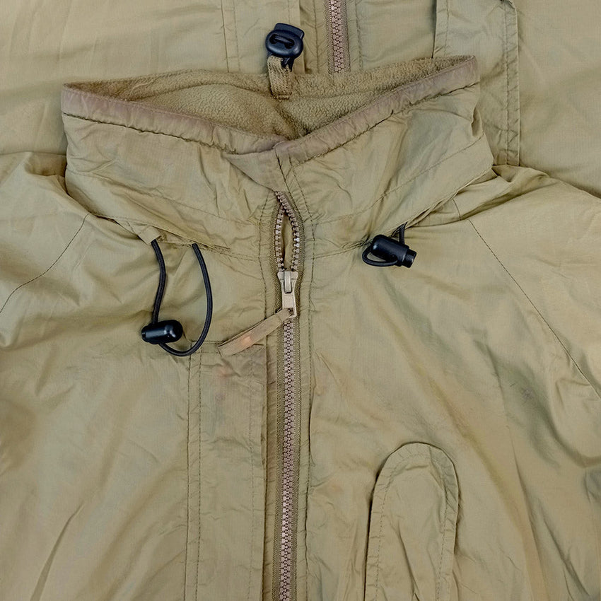 As part of the British military's Personal Clothing System (PCS), these were to be worn in colder regions, layered appropriately. These jackets have light polyester lining for heat retention and has a cosy, cloud-like loft to it. Drawstrings to the neck and bottom hem help keep cold from creeping in too. The nylon exterior provides some water resistance and compliments the light weight specs of the jacket. The interior of the neck is lined with fleece and to the back a hood is stored - great for keeping wind at bay or when a proper rain coat isn't on hand.
