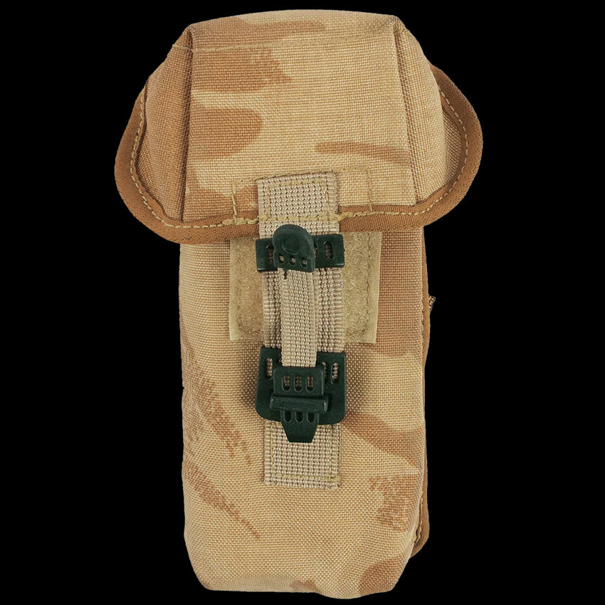 These were for operations in the Middle East. Each pouch can carry 2 x SA80 magazines. These have a 'Spanish' fly buckle with optional hook & loop underneath if you want faster reloads. The top lid closes around not just the front but also the sides to help prevent dust or any other debris from getting in and jamming your mags up (pretty crucial in the desert!). Chuck these on your belt, PLCE belt or a small PALS panel.