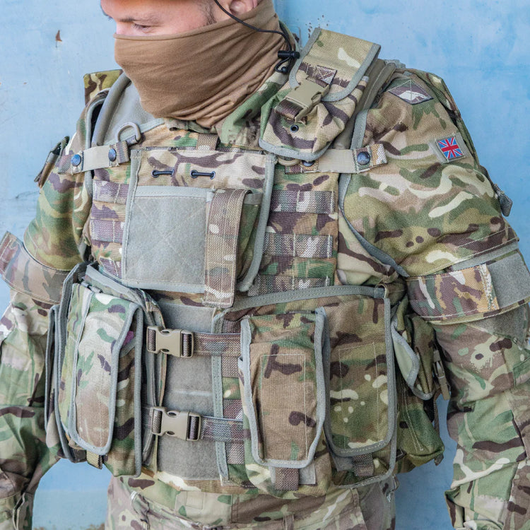 The modular British Army Osprey! The vest acts as a basis for the attachment of pouches and accessories, removing the need to wear a webbing harness or assault vest over protective layers. Introduced in 2010, the Mk.IV version improved user comfort and was made with modifications to the hook & loop coverage, improving fastening security.