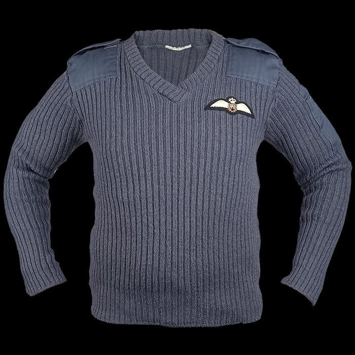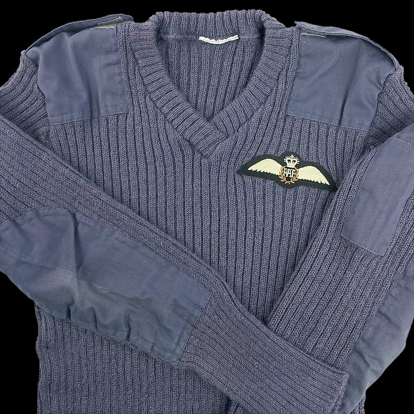 Just when you think there are enough British wooly pullys, another variation shows up. These are British Royal Airforce wool blend jerseys with the wide ribbing weave like the commando style - just with a V-neck. These are RAF blue too of course, which is kind of like a dirty sky blue - though somewhat inconsistent. Some may have insignia attached but some may have none. The reinforced areas & epaulettes are really the only hint that this cosy jersey wasn't originally for the general public but it still blends in to civilian life alright.