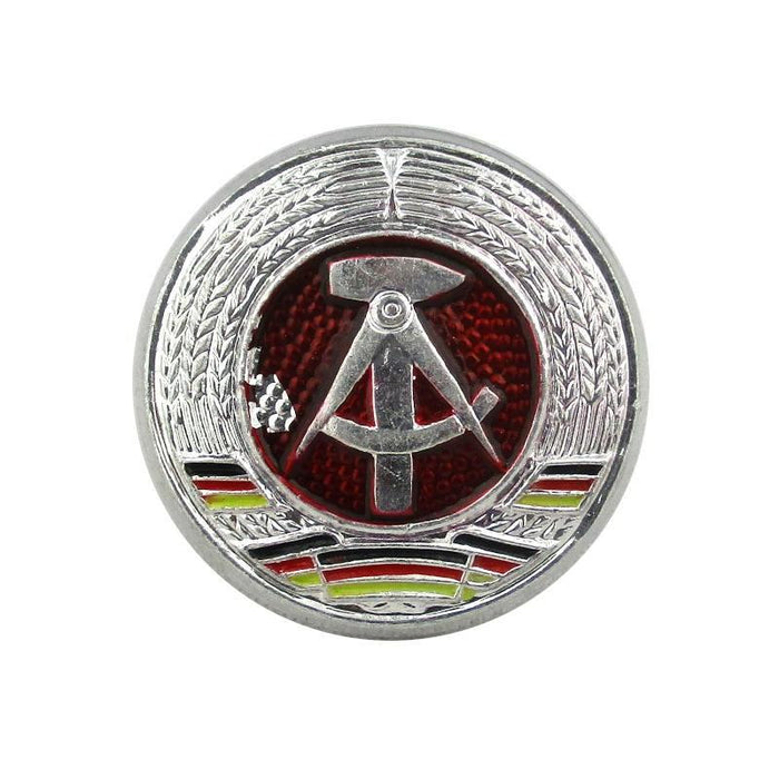 At the end of World War 2 Germany was split between the West and the East. The East became the German Democratic Republic under the Soviet Union. East Germany was to come up with their own uniform with a scent of Soviet influence. These badges were designed specifically to be worn on caps or Ushanka's. They sport the East German hammer and compass symbol surrounded by the German tricolour and wreath.