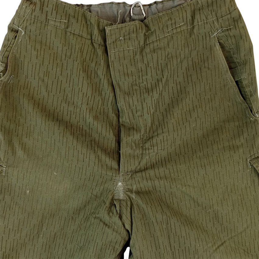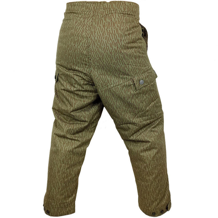 These trousers are what East German soldiers were issued for winter. With a smooth polyester lining and padded polyamide layer inside, these will keep you warm. The outside is made from a rugged cotton exterior and complete in the iconic strichtarn/strichmuster camouflage. No belt loops here - these are designed to be held up by Y-strap suspenders to help keep the weight off your hips.