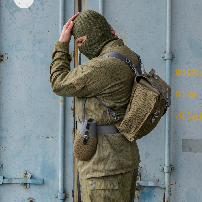 The cover features the Strichtarn camouflage pattern, nicknamed "rain camo". It uses snap domes to secure in the plastic canteen. The aluminium cup can then be strapped over the cap of the canteen. This strap also allows you to attach the set to a belt or rucksack. A convenient all-in-one set for your outdoor hydration needs.
