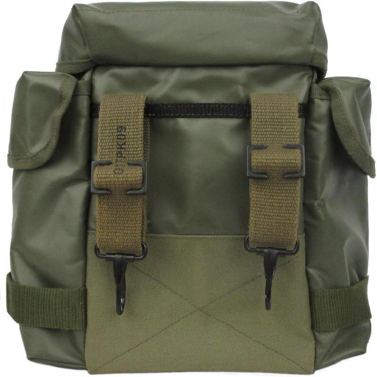 These gas mask bags are produced by the French and serve in both their military and the Polish (the same Polish gas mask is referred to as a MP5 instead of ARF-A). This ARF-A gas mask bag has a rubberised canvas construction and two side pouches. Straps and clips on the rear allow the bag to be attached to load carrying gear or slung over your shoulder. *Straps are not original.