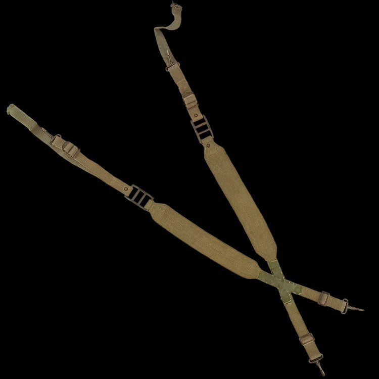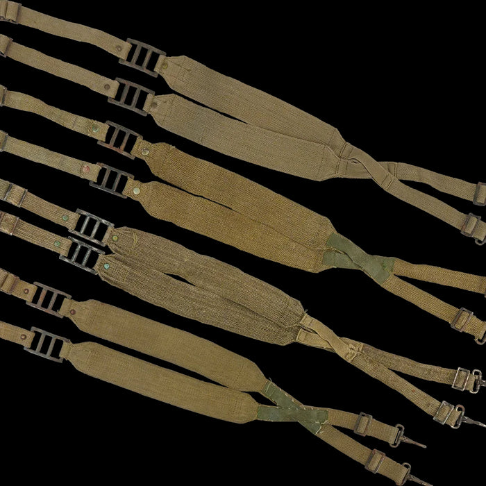 French crusty suspenders but a bit of history too. These were for the French TAP, the Troupes AéroPortées (airborne troops) and held up their webbing equipment. Similar in design to the US M1936 suspenders, these were often utilised by French Foreign Legion paras and during conflicts in Indochina, Algeria and the Suez Crisis. As seen in the images, there is a variety of canvas types and many of these are in a corroded and roughened state. We have two ''types'' to choose from, one having all 6 metal fastening clips and the other having 4 fastening clips.