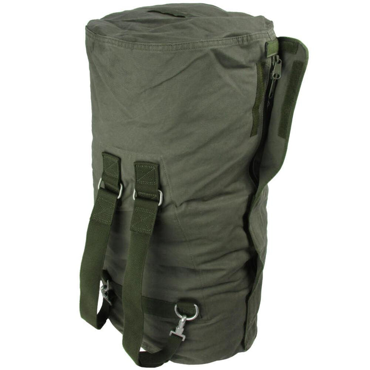 A heavy-duty, big, single compartment kit bag for carrying all your stuff. The German army has - as usual - built a bag to withstand a pounding. All the metal hardware (buckles, D-rings, and zip) is built to last.