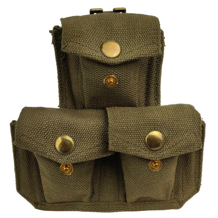 These vintage pouches from the Italian Army were used to store ammunition for Enfield rifles, designed to hold up to six 5-round charger clips of .303 rounds. Some are likely British made but had been surplus and sold onwards. The pouches are constructed from cotton canvas, as was the standard material of choice back in the 1940's and '50's. Each individual pouch is divided in half to hold two clips. On the rear are brass tabs for attaching to a webbing belt.