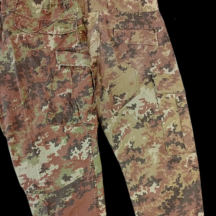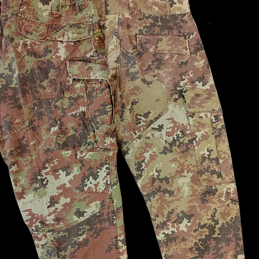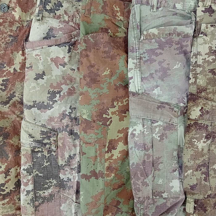 Vegetato is the current camouflage of the Italian military. Many variations of it exist, some intended and some perhaps accidental - Italy seems to have outsourced most of its production to various Romanian factories. The majority of what we have received is in the original green & brown pattern, but we seem to have the odd arid/half desert schemes mixed in. Either way, each one is definitely unique looking!