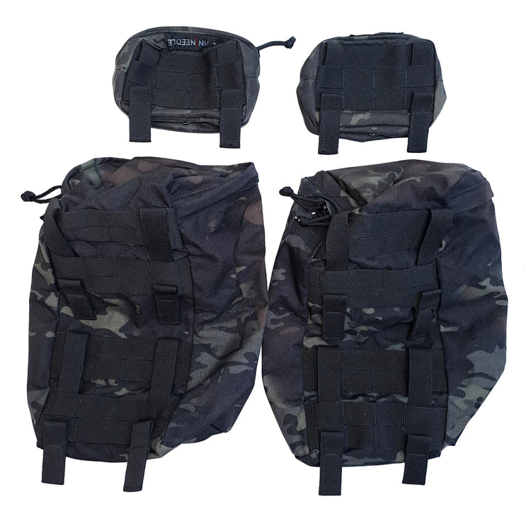 A pair of MOLLE rucksack side pouches and small utility pouches in Multicam Black. Used by an Ex-New Zealand Defence Force service member who's added a dusting of spray paint over them. Manufactured by TwinNeedle NZ.