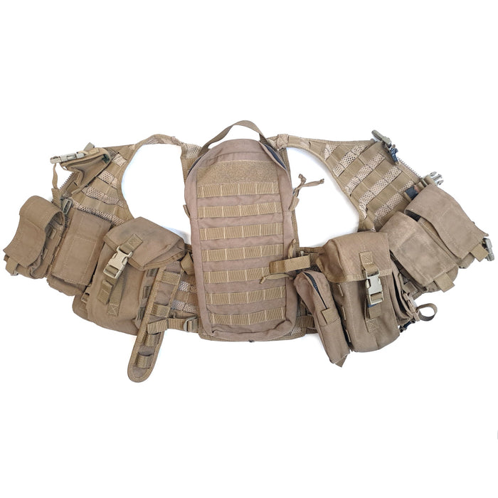 Features four double Styer magazine pouches, grenade/field dressing pouch, smoke grenade pouch, radio pouch, two GP pouches, hydration pouch , small utility pouch, and bayonet frog. The magazine pouches are well worn but only the one in the last photo has holes. All still serviceable.