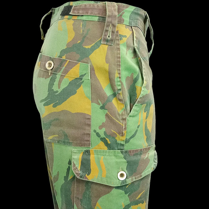 The first distinctly New Zealand issued DPM, Value Grade. These trousers from around the mid the 80's have a classic mishap of NZ camouflages - weird colours. These are adorned with blue-greens, ultra mustard yellows. Quite outrageous and when faded, even more so. As Value Grade items, these may have larger repairs, stains, small holes, missing components such as buttons, patchy fading or other small damages. As these were a winter weight fabric, eventually people realised this uniform was not only difficult to blend in with, but too heavy for New Zealand's climate.