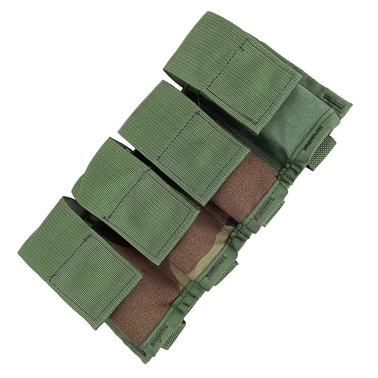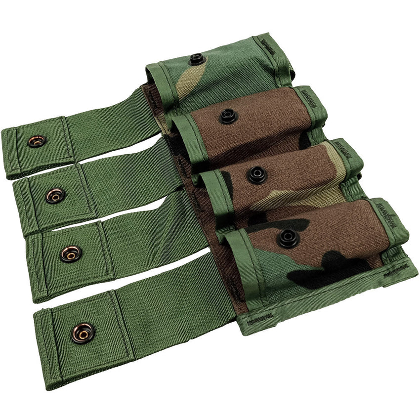That's right, a pouch for 4x 40mm grenadas. Designed for the MOLLE attachment system so the pouch can be carried on combat vests, belts and other load bearing gear. The pouch features four compartments each with a snap dome cover, made from durable Cordura nylon. The bottom is open – don’t worry it won’t lose your grenade round, it is designed to drain water and debris from building up in the pouch. Use one of these pouches to carry 40mm airsoft/paintball gas grenades, massive tubes of MRE condensed milk or anything else 40 mike-mike sized (that wont fall out the bottom)!