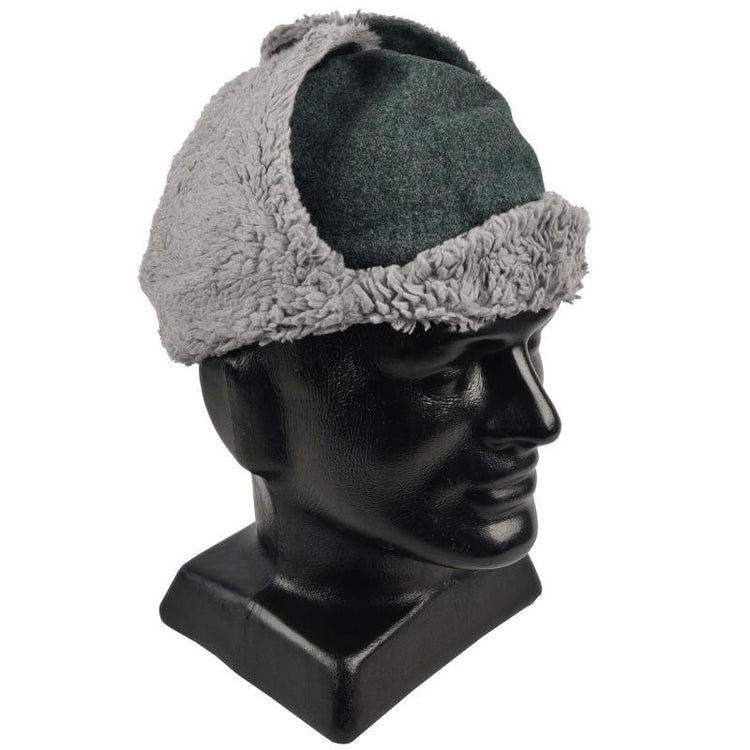 It's Swiss, it's military, it's your next winter hat. A classic military cold weather hat, made in Switzerland. The shell is of a felt wool material with faux sheep skin lining the headband and ear flaps. Much like the country of origin, the colour is quite neutral—grey with a tint of blue/green.