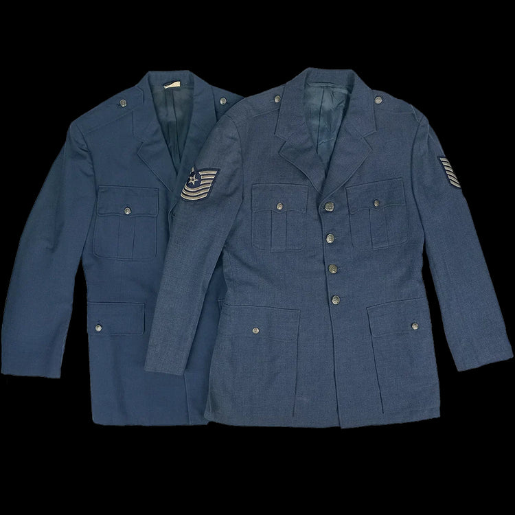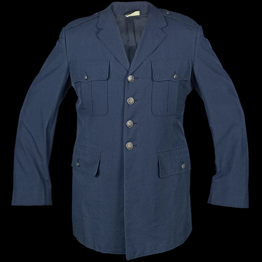 These versions maintain the same Air Force blue colour, fit and formal appearance while ensuring comfort in tropical environments. These jackets span several production periods - fabric content and texture may vary, though most are a wool/polyester mix. Some jackets will have patches and if so, these vary.