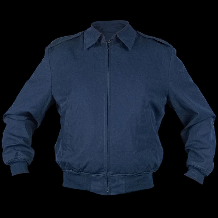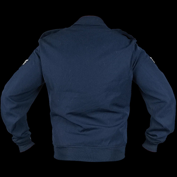 These jackets have ribbed cuffs and bottom hem, much in bomber jacket style but without the sheen and with a fold down collar. Some of these jackets have no embroidery or patches, some of them do.