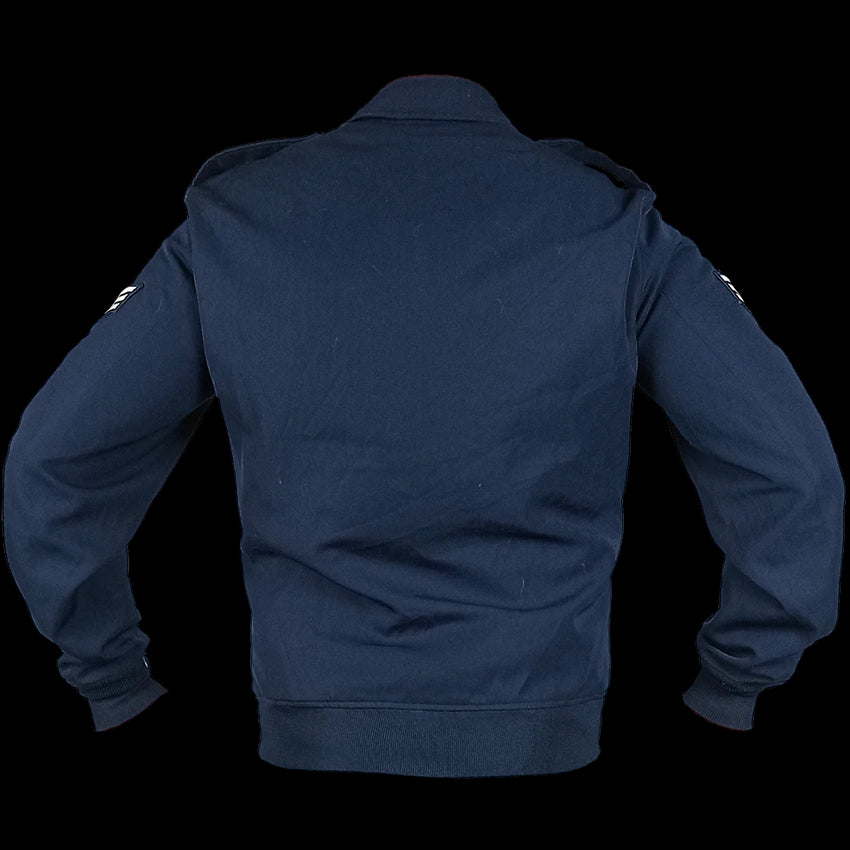 These ones have a sleeveless, vest-style, light polyester liner for those colder moments. The liner attaches with hook & loop and will keep your torso toasty. These jackets have ribbed cuffs and bottom hem, much in bomber jacket style but without the sheen and with a fold down collar. Some of these jackets have no embroidery or patches, some of them do.