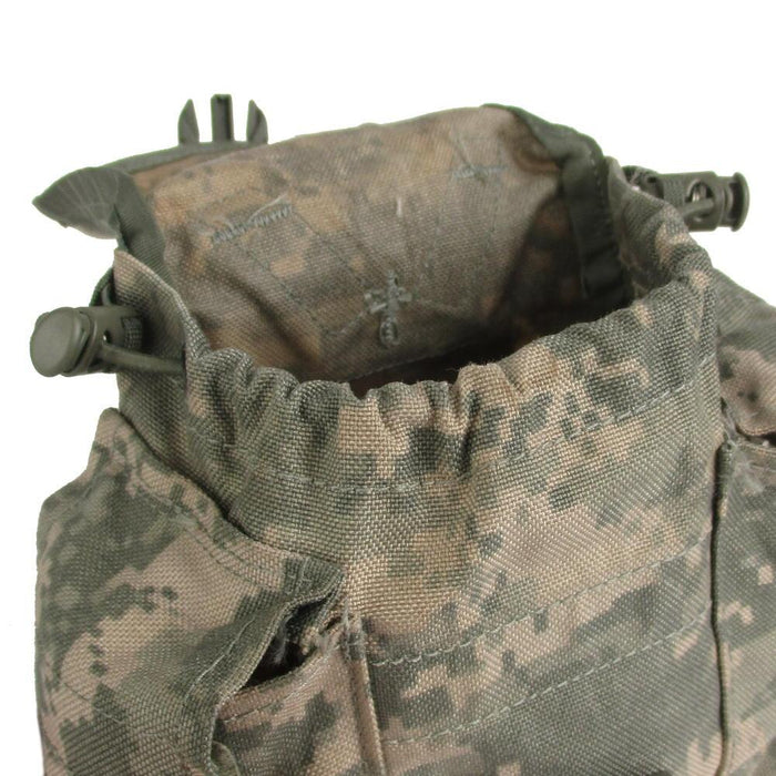 Constructed from a durable nylon fabric with a solid plastic buckle to secure down the top flap. A drawstring around the top is used to fasten the canteen in place, if that's what you're using it for. Two side pouches allow you to store water purification tablets or any small items like bandages, matches or multi-tools. Located on the back are the MOLLE straps for attaching the pouch to your gear. A convenient way to carry your hydration device while hiking or hunting. Or match it with your UCP (Universal Camouflage Pattern) combat gear for airsoft.