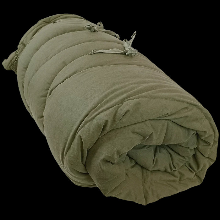 These thick, lofty, groovy cocoons were issued from the 70's up until around the 2000's - keeping troops warm for ages. Featuring the tapered mummy/sarcophagus shape for heat retention, these are quilted, insulated with feather down and have polyester batting in the storm flap. These have a roomy canoe-shaped toe box too. The exterior is constructed from a water repellant, durable poplin cotton and has two very handy ties for securing when rolled up. Keeping these sleeping bags in optimal condition for such harsh environments required a few rules for use, as noted on legible inner tags.