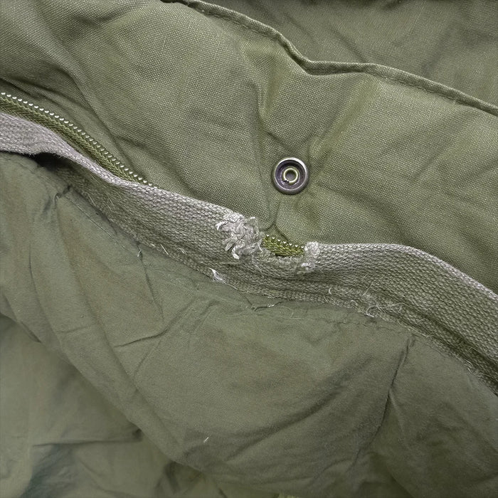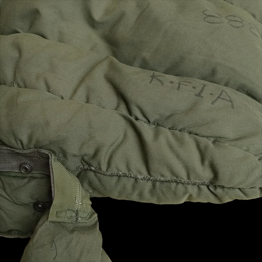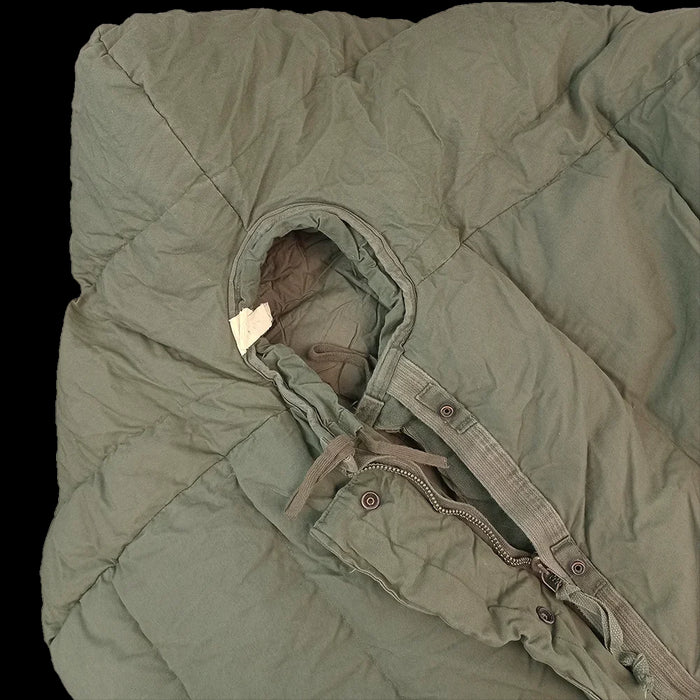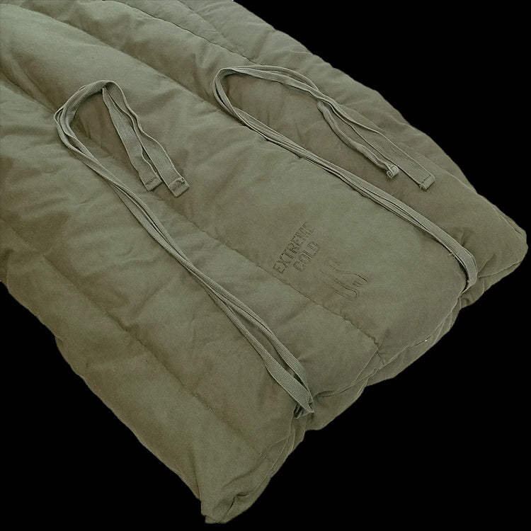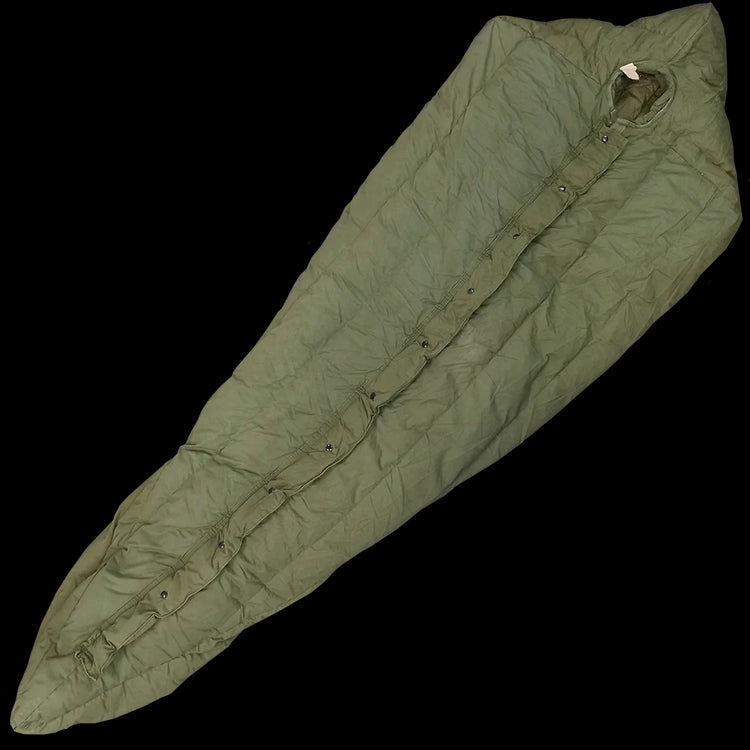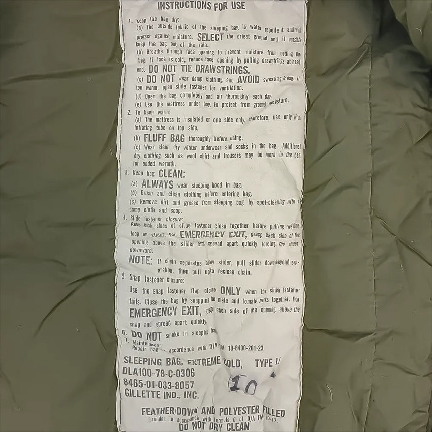 These thick, lofty, groovy cocoons were issued from the 70's up until around the 2000's - keeping troops warm for ages. Featuring the tapered mummy/sarcophagus shape for heat retention, these are quilted, insulated with feather down and have polyester batting in the storm flap. These have a roomy canoe-shaped toe box too. The exterior is constructed from a water repellant, durable poplin cotton and has two very handy ties for securing when rolled up. Keeping these sleeping bags in optimal condition for such harsh environments required a few rules for use, as noted on legible inner tags.