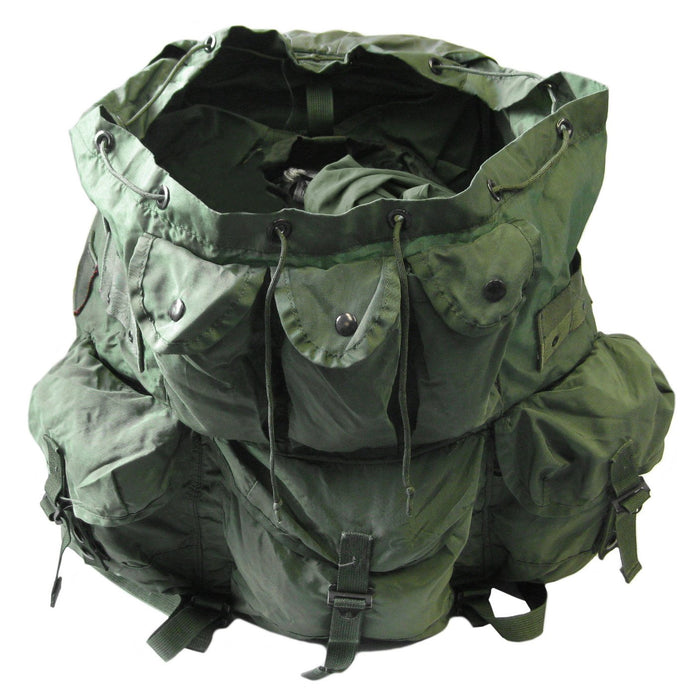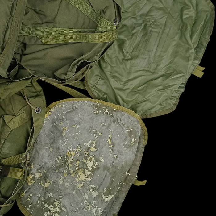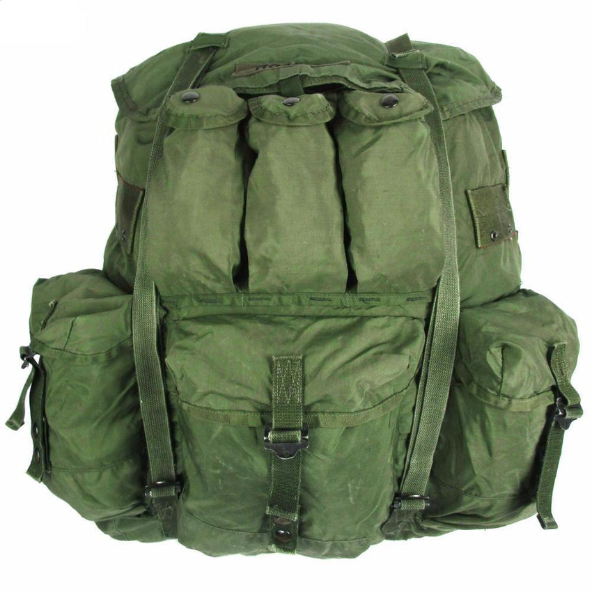 This large field pack from the US army is made of water repellent treated nylon duck and webbing, spacer fabric, and fastened with metal hardware. Some of the older issue packs have the common issue of this waterproofing degrading and this may have a residue. This pack must be used with the ALICE frame, and a commercially produced new one is included. Also included are commercially produced, new shoulder straps and lumbar pad with waist strap, to make sure you're all set up. Some may have the oldschool waist belt & buckle like the grey one pictured but most are the reproductions, with black fast clip buckles.