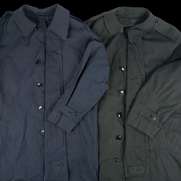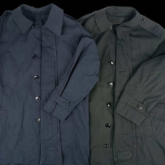 These are a picked at random mix of US Air Force dark navy blue and Army black, used over dress uniforms. These ones are without a zip in liner, so more lightweight and appropriate for those warmer but not-too-warm months.