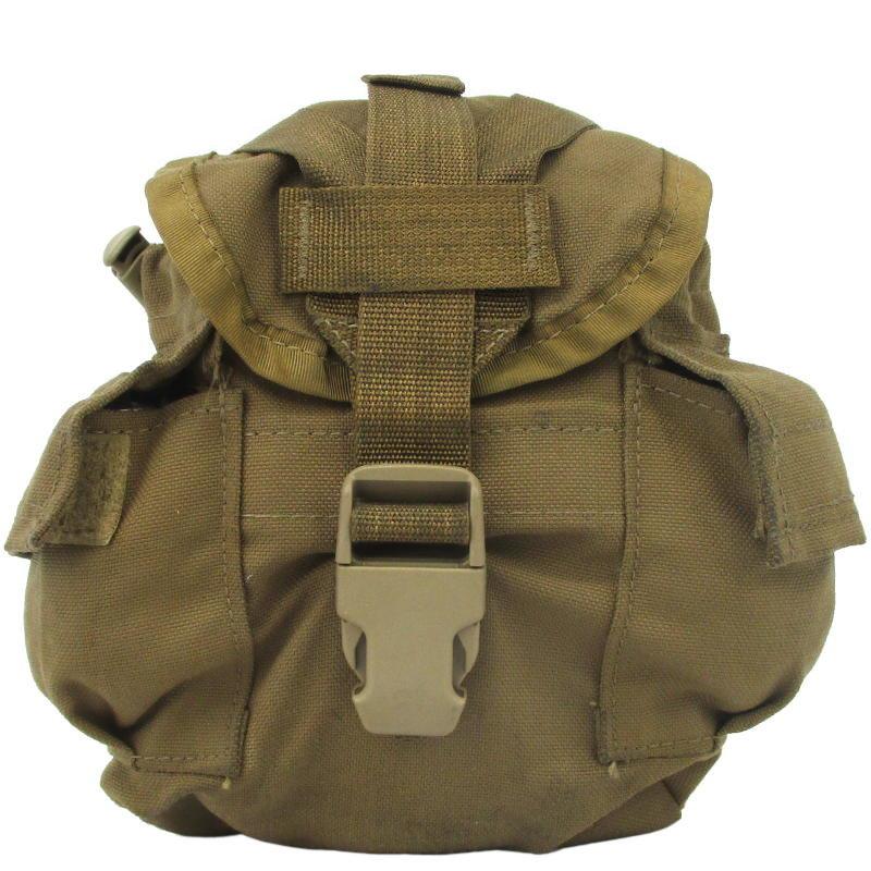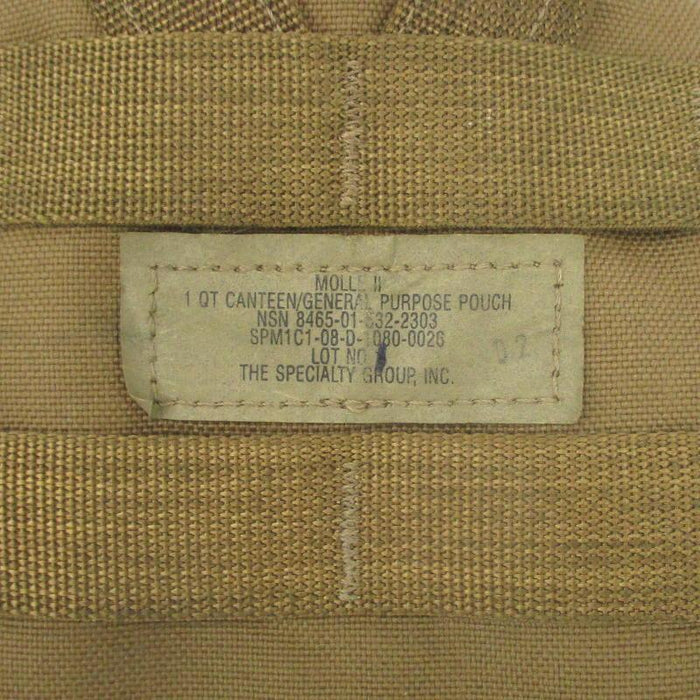 The MOLLE II coyote canteen pouch will accommodate a 1 quart (0.95 litres) US canteen, water purification tablets and matches or other fire starters. Labeled "POUCH, CANTEEN CARRIER/UTILITY", indicating that it can be used for general purpose items as well. Dual MOLLE straps allow the pouch to be attached to belts, combat vests and packs.