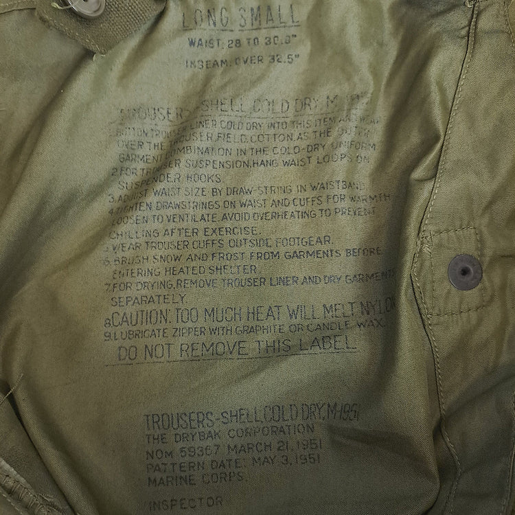 United State Marine Corps issue M-1951 cold weather shell trousers with M65 liner. manufacture date 1951.