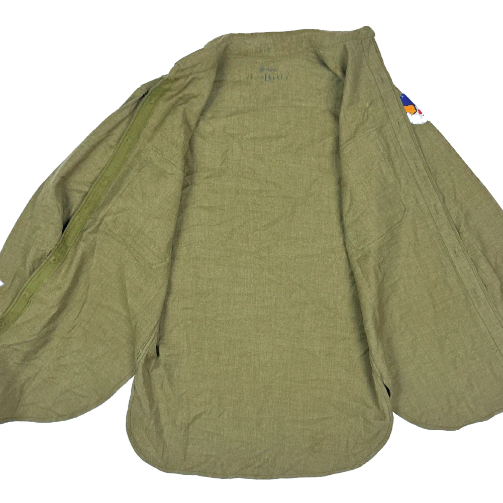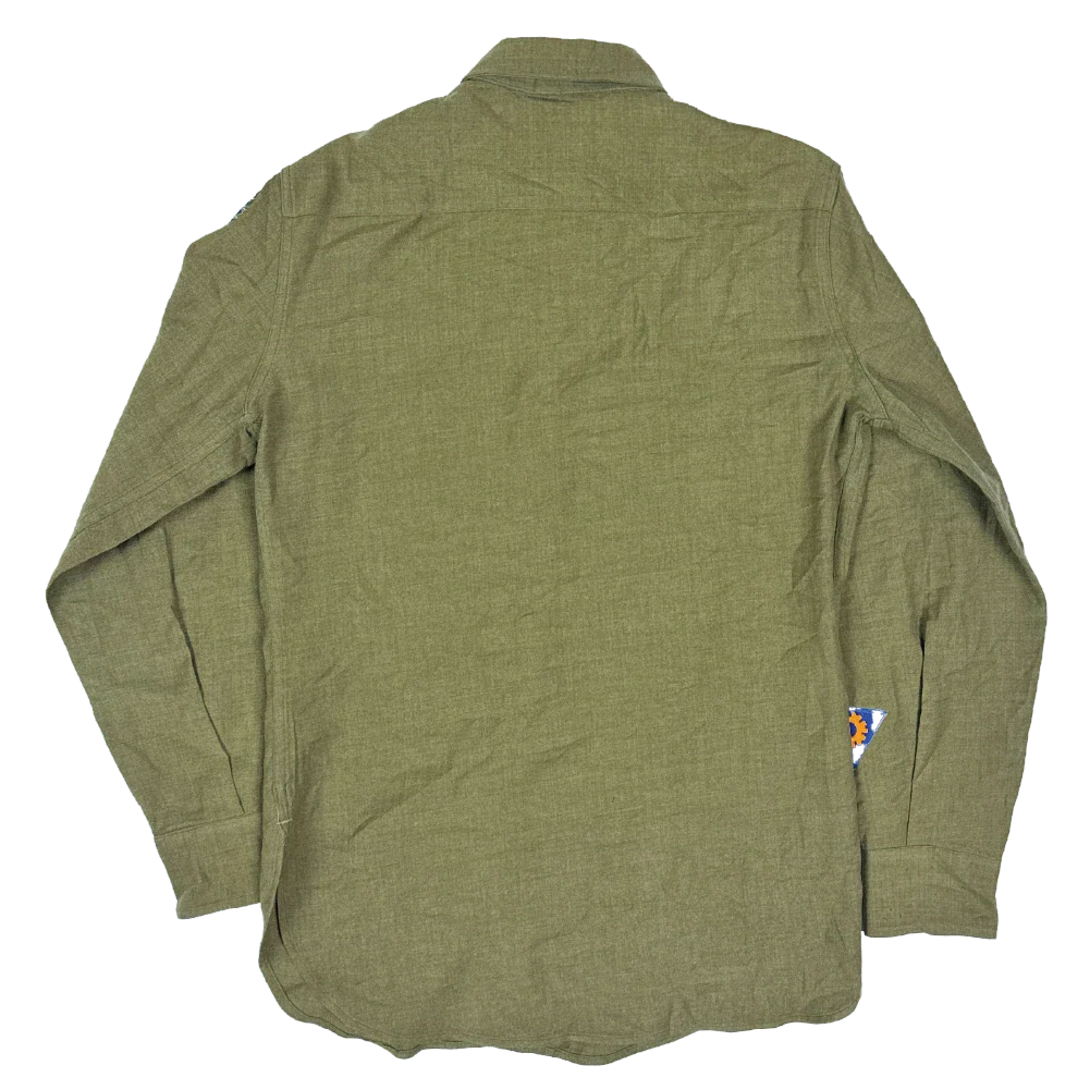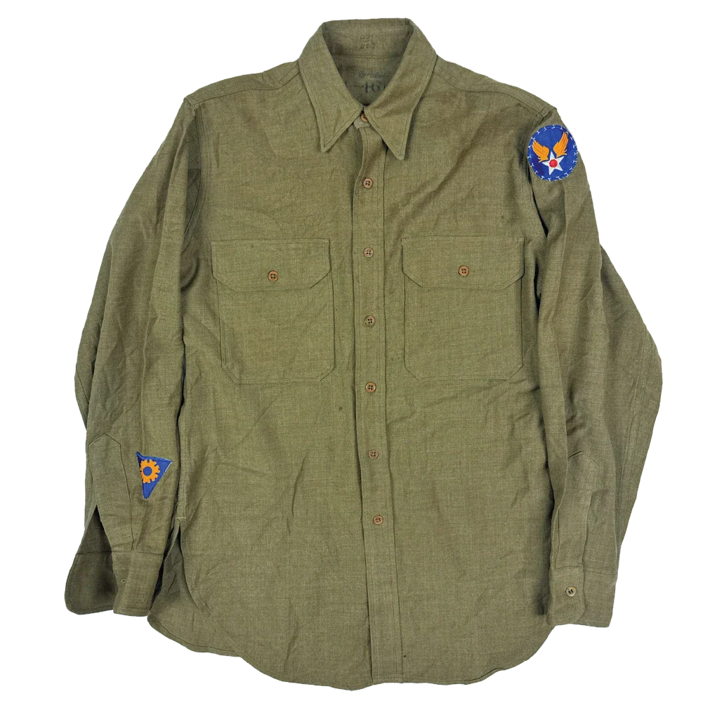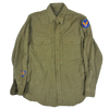 US World War II M37 wool shirt in Medium. This example features two chest pockets and buttoned cuffs. It displays US Army Air Force and Engineering Specialist cuff insignia.