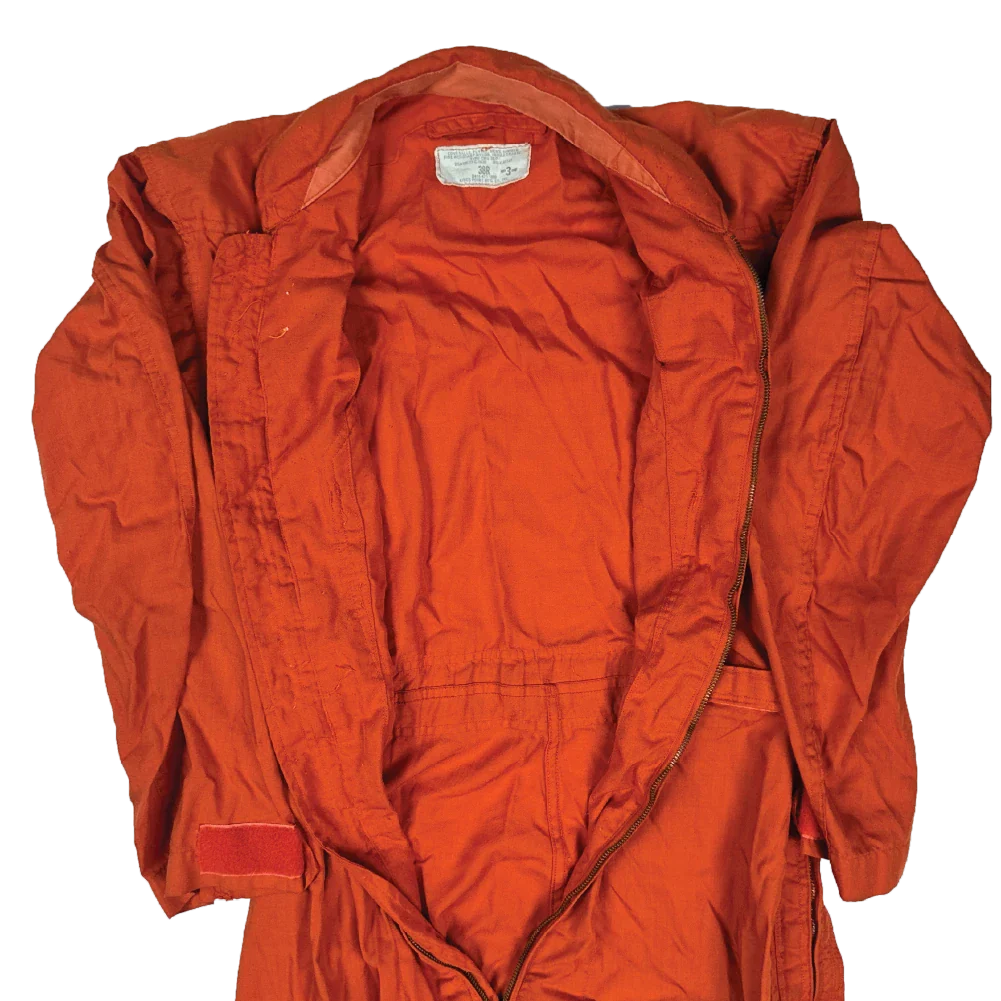 USGI summer flying coveralls dated 1971. One-piece coverall with a zippered front and multiple storage pockets. Finished in orange.