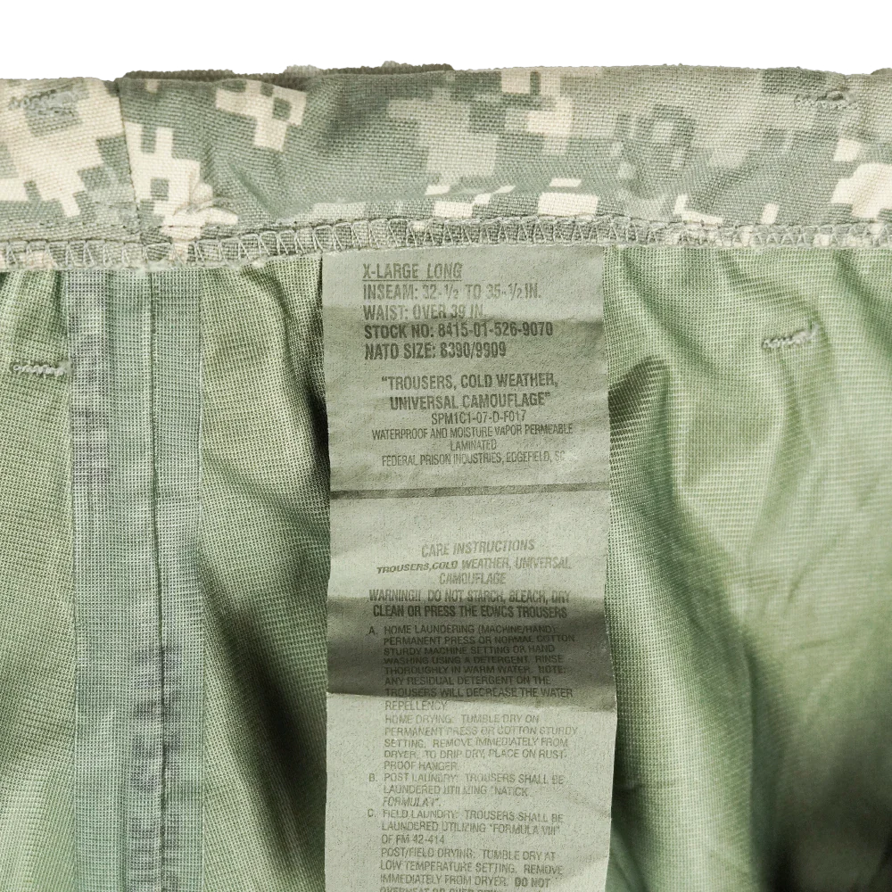 USGI Gore-Tex trousers in ACU pattern. Waterproof shell construction with full-length leg coverage and sealed seams. Manufacture date 2007.