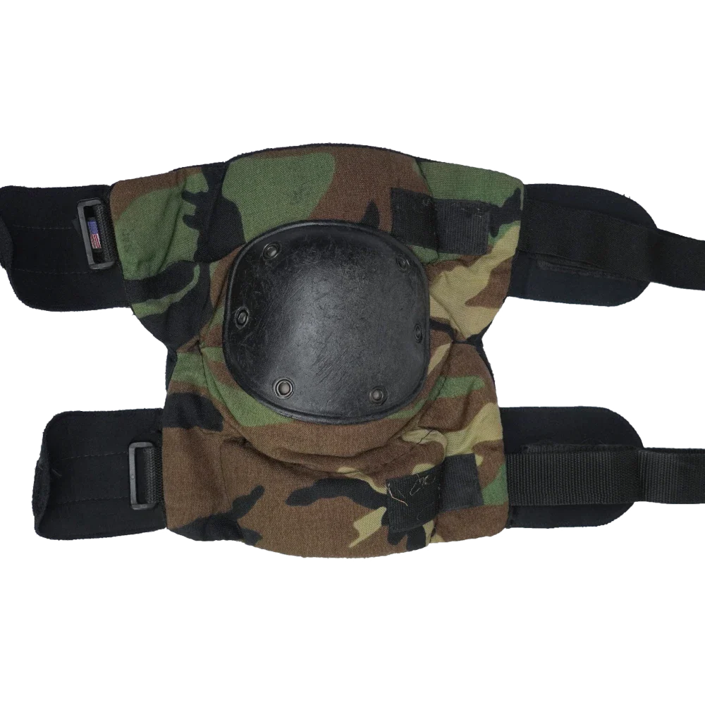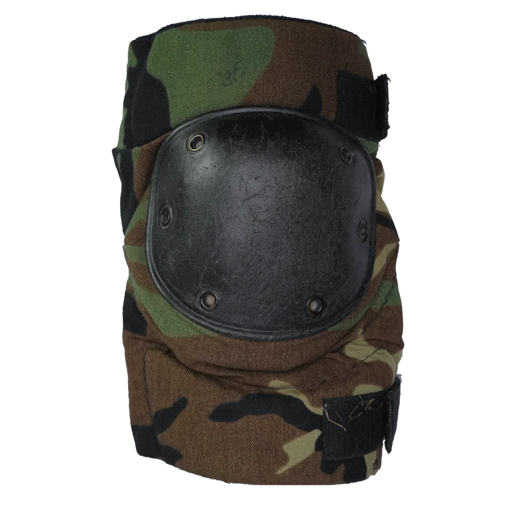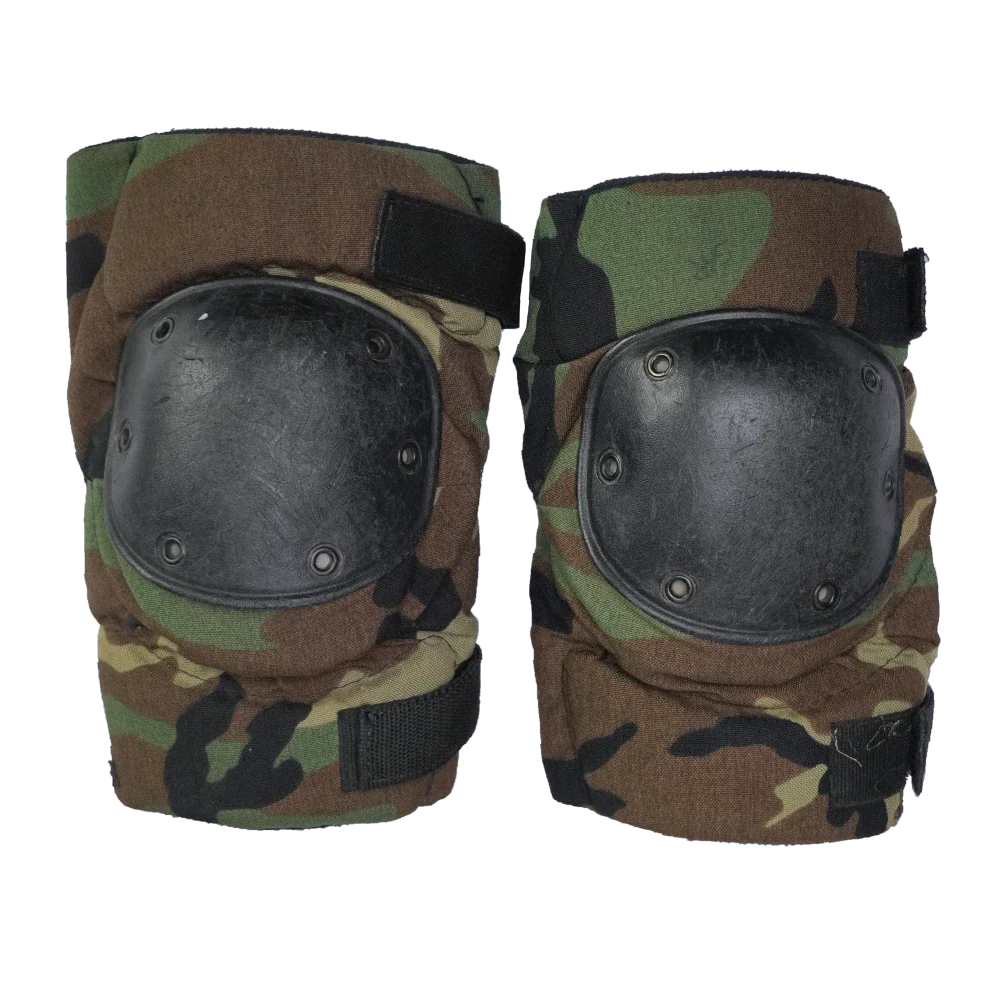USGI Woodland knee pads in Woodland camouflage pattern. Designed with a hard outer protective cap and adjustable fastening straps for fit.