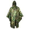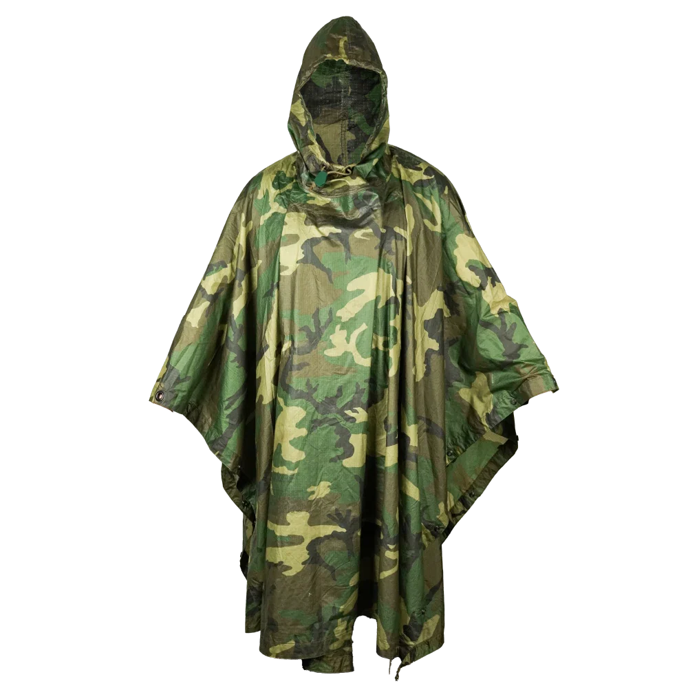 U.S. Government Issue woodland camouflage poncho produced to U.S. military specifications for wet-weather use. Lightweight construction with an integrated hood and snap fasteners along the sides.