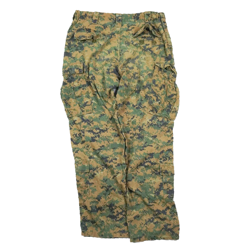 Surplus USMC FROG trousers in Woodland MARPAT camouflage. Features multiple storage pockets and a button fly with elasticated waist. Manufacture date is 2007.