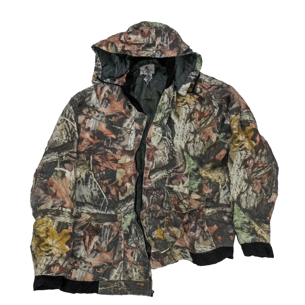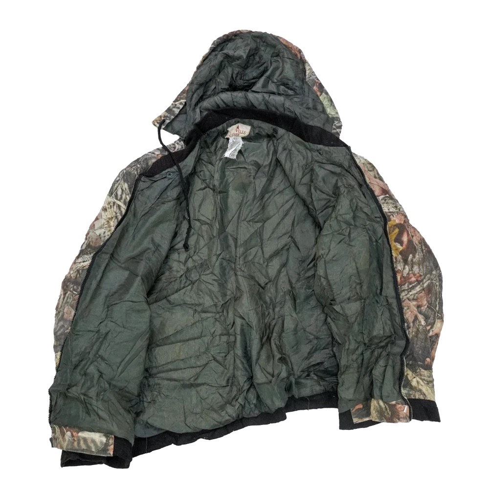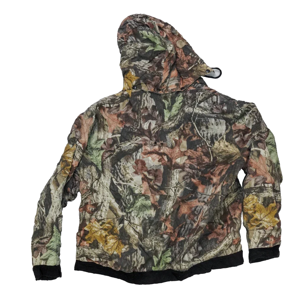 Commercial bomber jacket in Advantage camo with a lined construction and attached hood. This is a heavier jacket with a classic short bomber-style cut and all-over camouflage pattern.