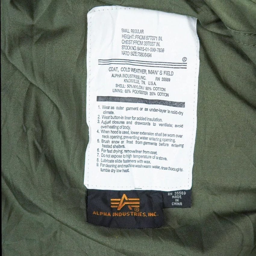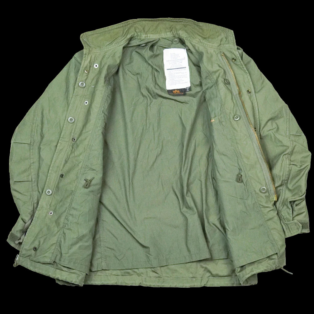 Commercial M-65 style jacket by Alpha Industries in olive drab. Constructed from a cotton/polyester blend and finished with a snap-up storm flap and hook-and-loop neck closure.