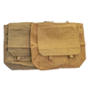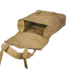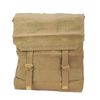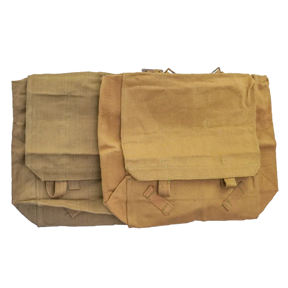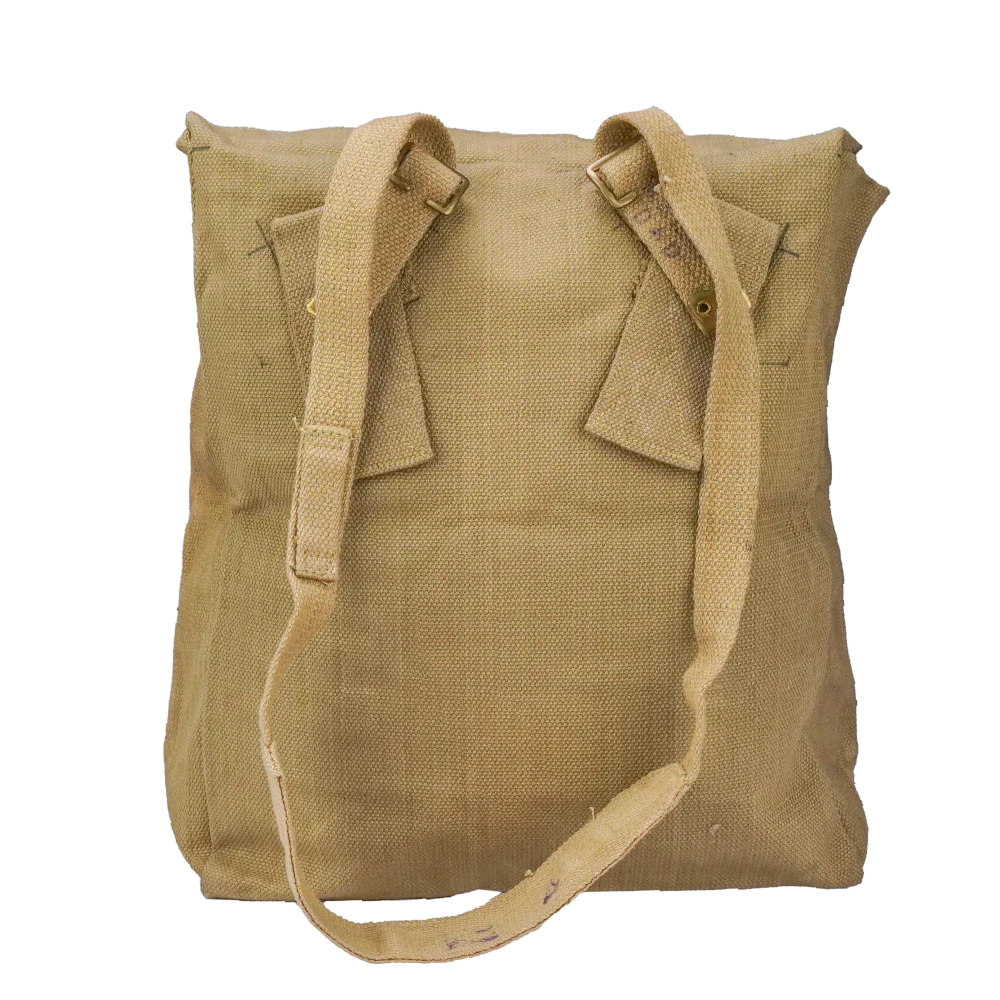 The interior provides a single main compartment with a stiffened back panel and stitched seams for structure. Webbing loops and attachment points are fitted on the rear, along with adjustable shoulder straps. Two colour variants exist in greenish-khaki and yellowish-khaki webbing, picked at random.