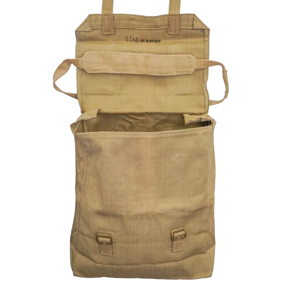 Australian Pattern 1937 (P37) haversack constructed from heavy woven cotton webbing with brass fittings and internal fibreboard stiffening panels to help the bag hold its shape. The design features a large flap closure secured by two adjustable webbing straps with brass buckles, and a reinforced body with stitched panel construction.