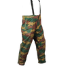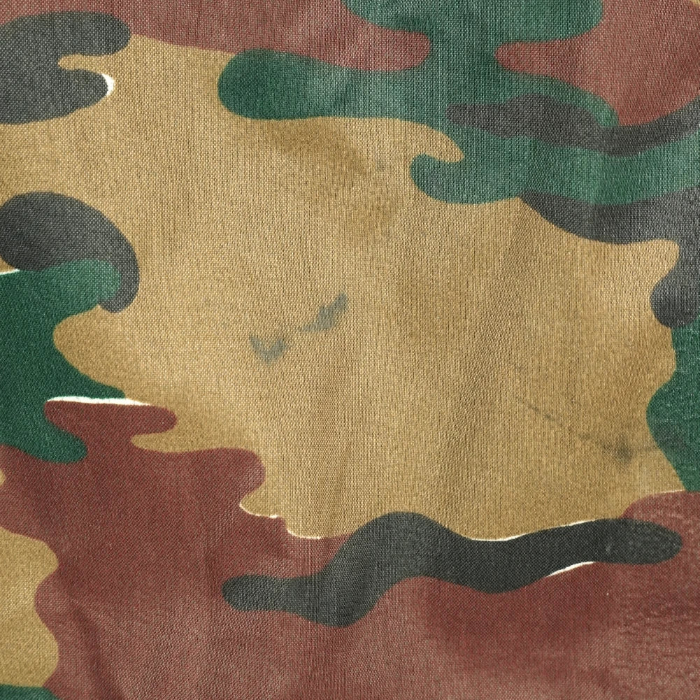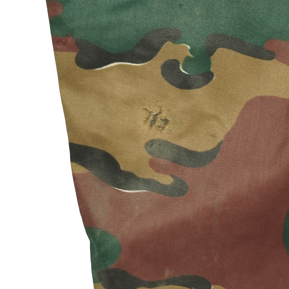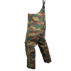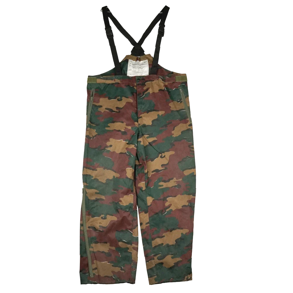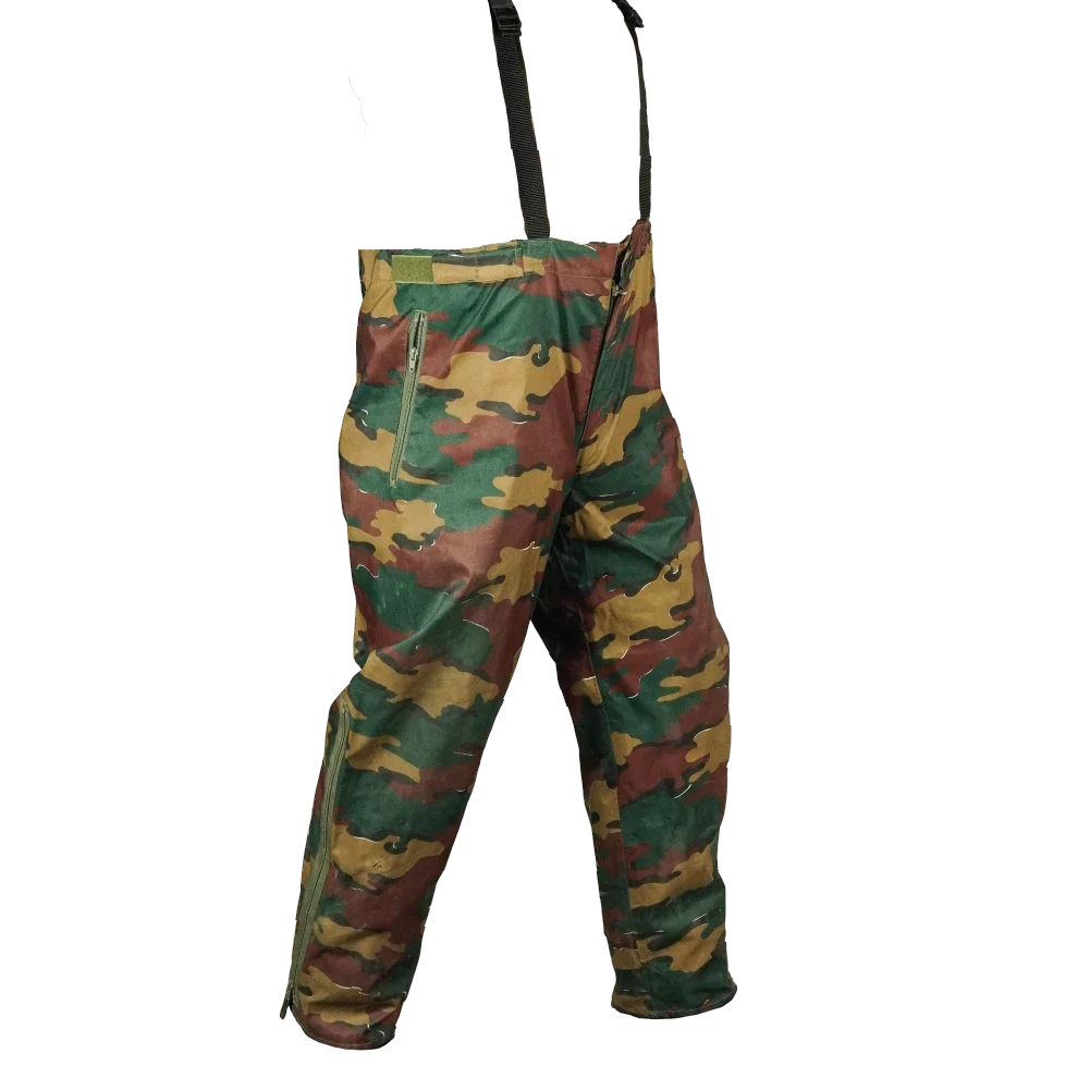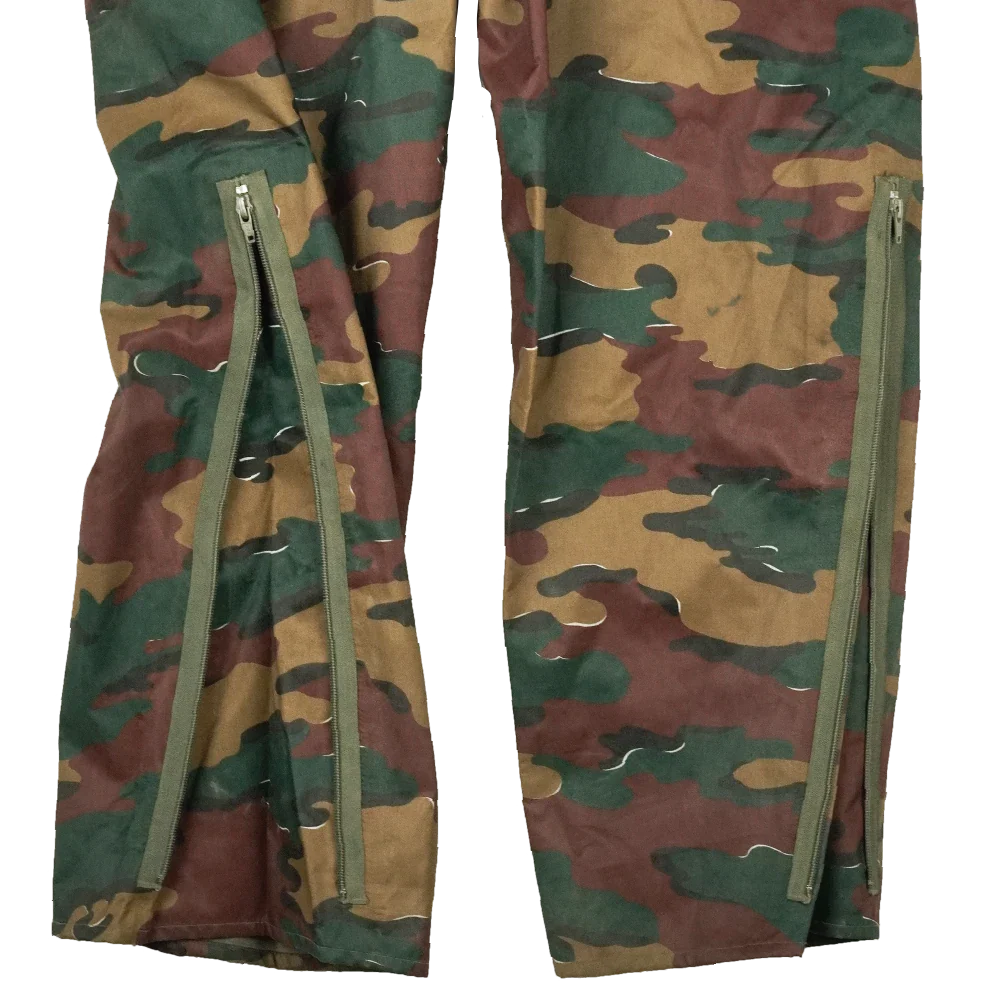 Surplus Belgian wet weather trousers in jigsaw camouflage. Designed as a waterproof outer layer, these trousers feature a loose over-trouser cut intended to be worn over other clothing.
