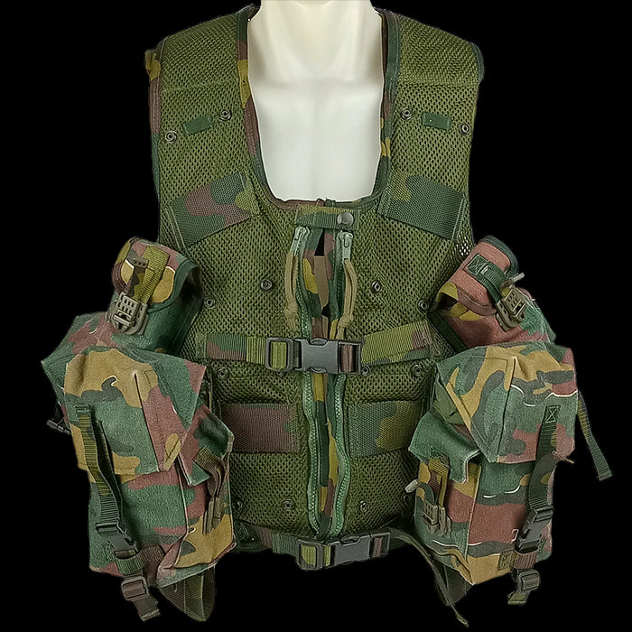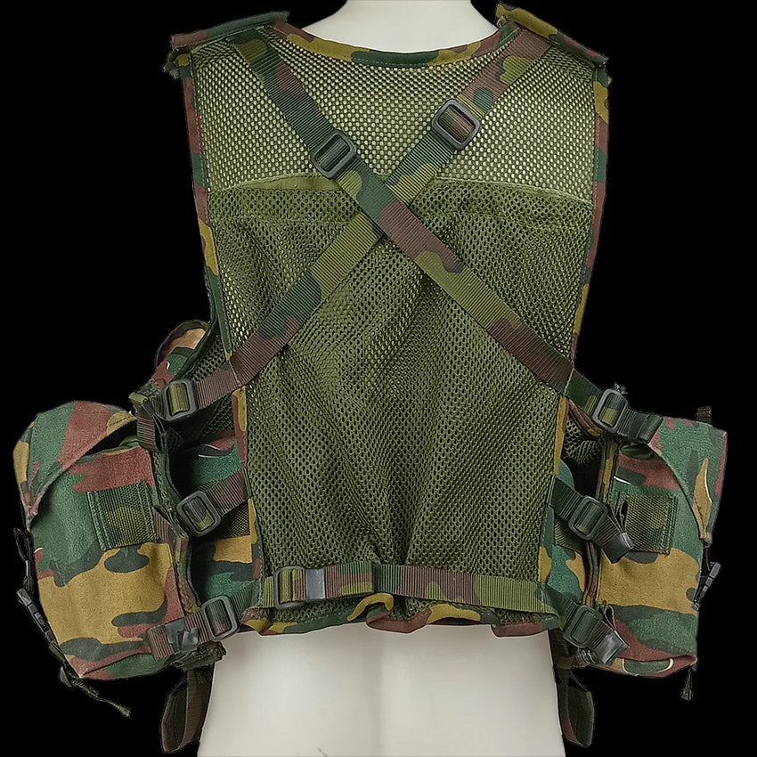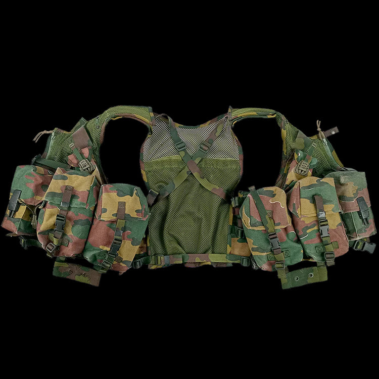 These are loaded with storage. We have a good handful of vests without ammo pouches but all vests have 4, yes four, utility pouches. These happily carry canteens or whatever you may want to lug about! For vests with mag pouches, these can hold 3 mags each and have that oldschool tension peg closure, akin to those on ALICE magazine pouches. All vests have grenade pouches too, with speedy Spanish fly type closures. Two vertical chest pockets have pistol holsters in each side, in case you need ''one for each of ya'', like some kind of mad Belgian Doc Holiday (...or to suit your dominant hand). Vests may accommodate additional pouches via the webbing loops to each side of the upper chest, or to the rear-most utility pouch sides. Geared up to the gills!
